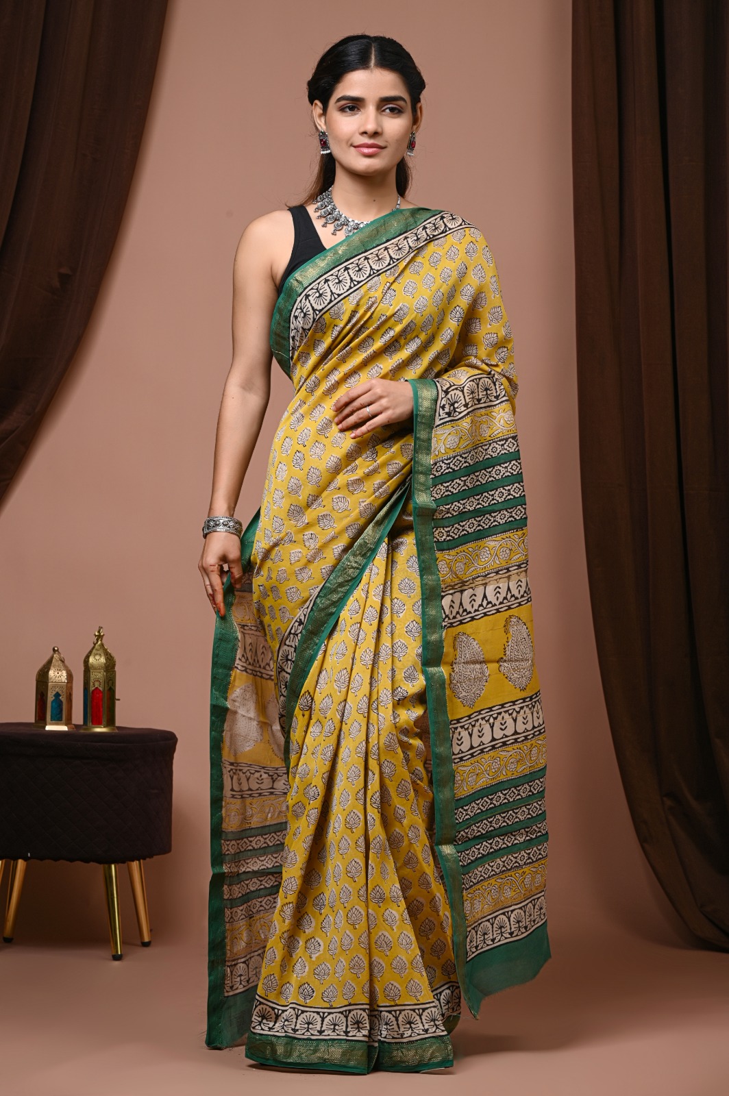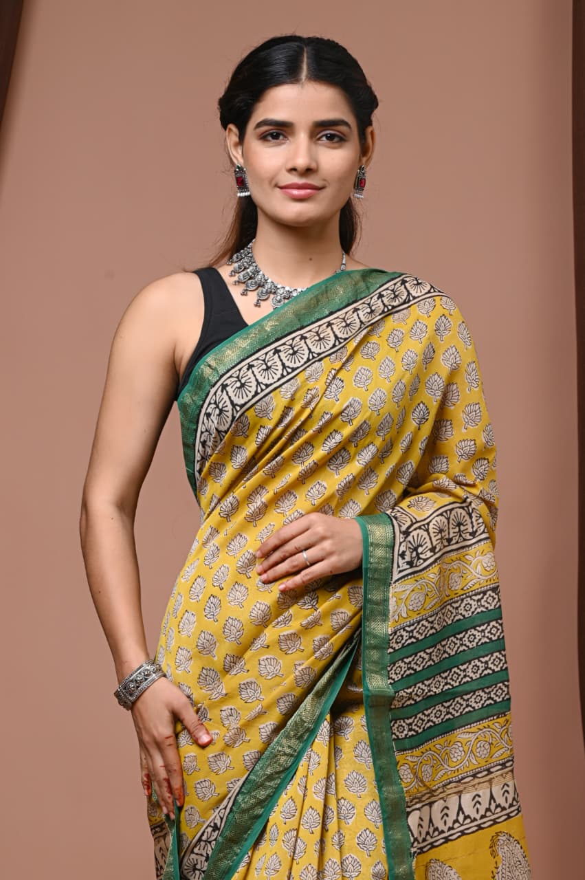 In a world that often feels rushed, why not embrace a garment that offers a tapestry of stories? Our Mustard Floral Block Print Maheshwari Silk Saree is an ode to the exquisite craftsmanship of Rajasthani artisans, painstakingly created with distinct block printing techniques. Each fold of the fabric whispers of tradition, inviting you to experience its lightweight grace against your skin.