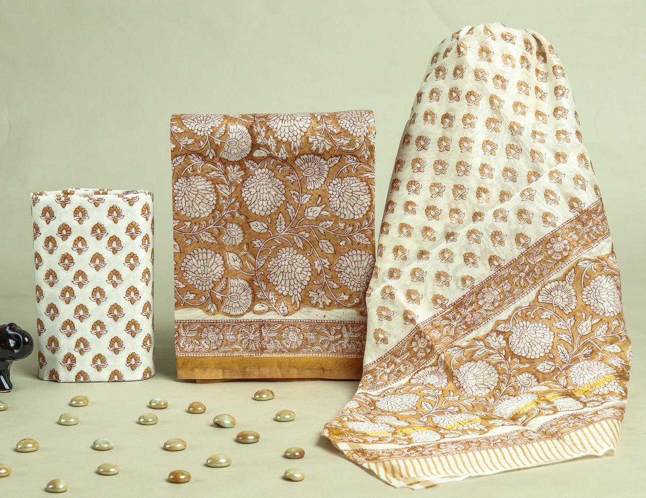 The mustard brown and off-white color palette exudes elegance, perfect for ethnic occasions. The detailed floral and leafy block prints showcase the craftsmanship of Indian textiles. The chanderi silk fabric adds a touch of luxury, making it a standout choice for those who appreciate fine quality.