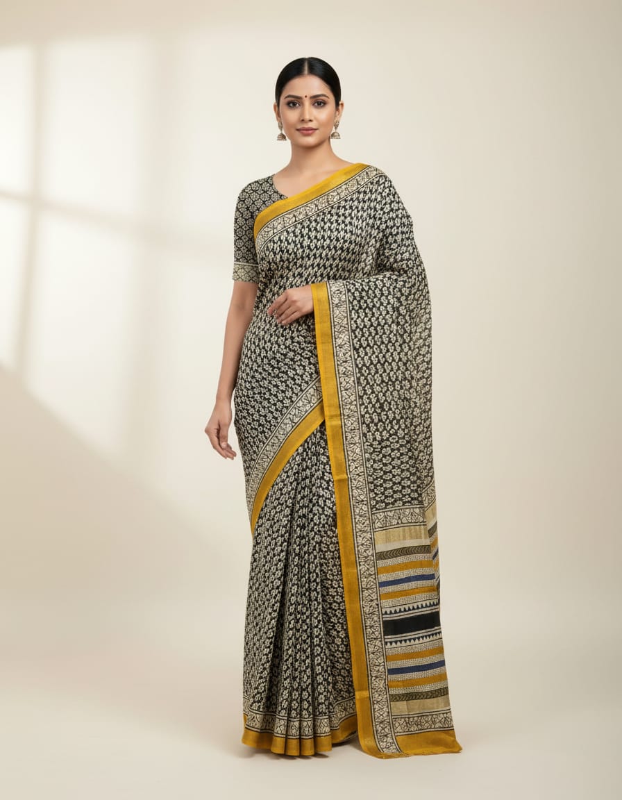 Adorn yourself in the deep allure of black, beautifully contrasted by an eclectic blend of white floral motifs and striking geometric patterns. The rich mustard yellow border of this saree adds a vibrant touch, creating a visual tapestry that captures the essence of Indian craftsmanship. Each piece is artisan-crafted, highlighting a stunning interplay of traditional and contemporary aesthetics that effortlessly draws the eye.