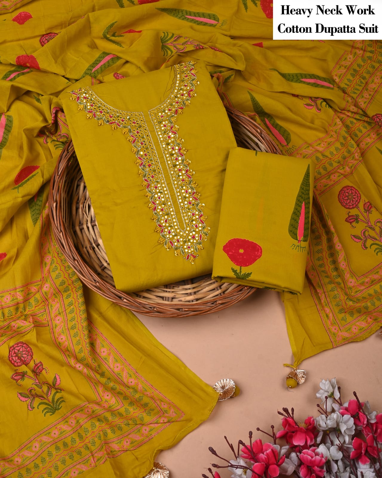 Searching for a standout piece that harmonizes tradition and contemporary aesthetics? This vibrant mustard ensemble is a canvas of intricate floral motifs, beckoning you to explore the beauty of hand block printing. The soft cotton fabric envelops you in comfort, while the elegant neckline embellished with handcrafted Gota Patti work adds a touch of sophistication.