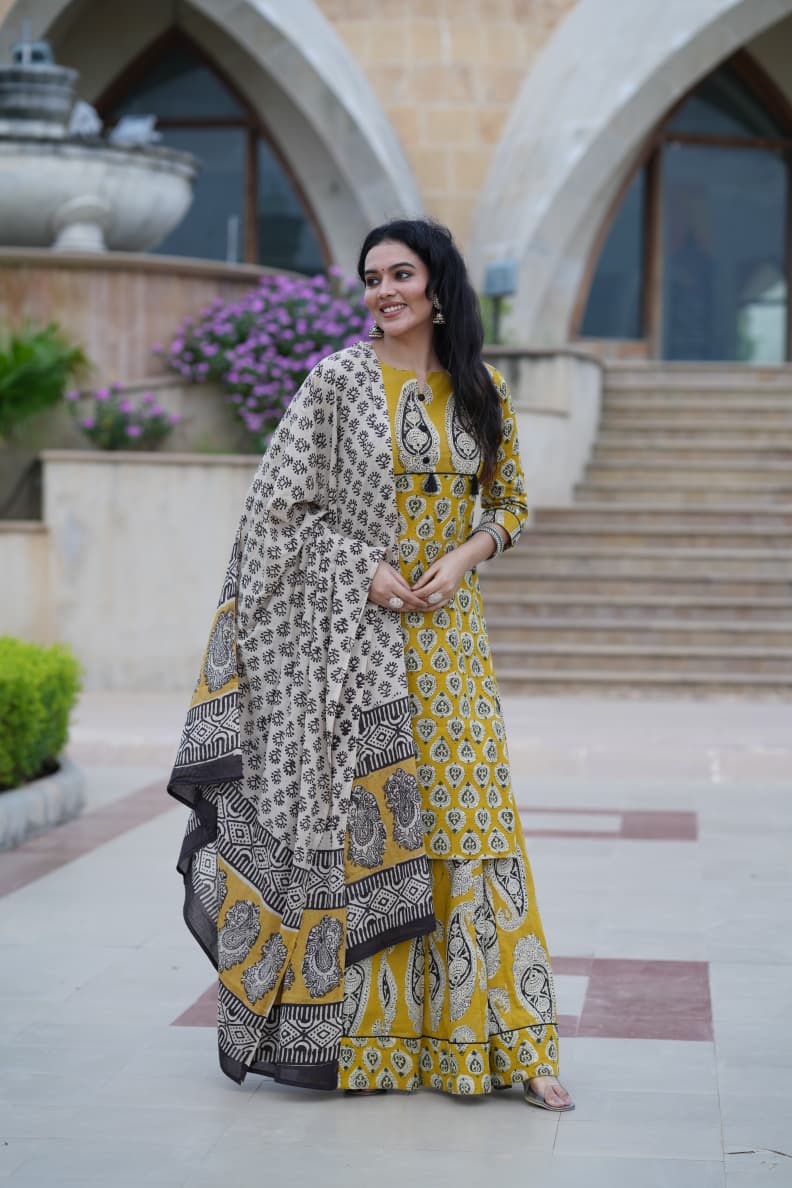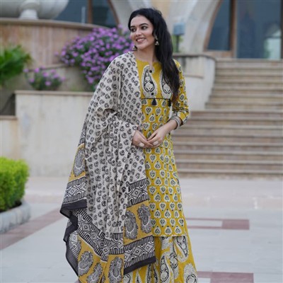 Elevate your ethnic wardrobe with this artisanal ensemble featuring intricate hand block printing on soft, breathable cotton fabric. The long kurta boasts floral patterns in mustard yellow, harmonizing with the palazzo pants and dupatta. Embrace traditional craftsmanship and timeless style with this premium ethnic set.