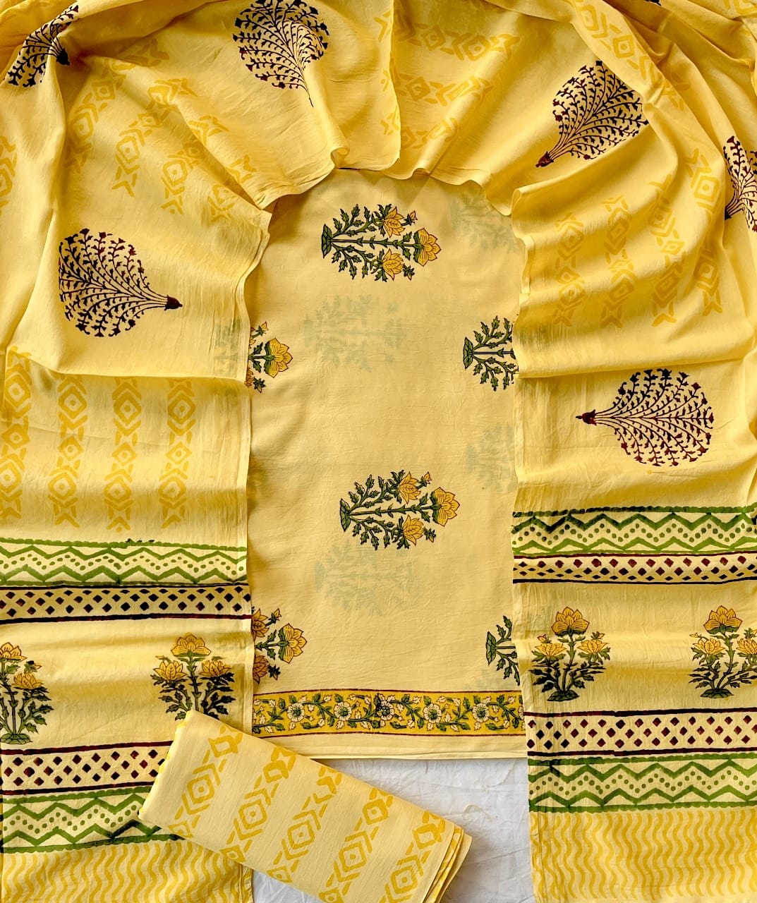 Indulge in the art of hand block printing with this exquisite Mustard Floral Cotton Suit Set from Blockart. Crafted with care, each piece showcases intricate floral motifs in shades of mustard yellow and green. The set includes a top, bottom, and dupatta, all made from premium cotton for comfort and style. Elevate your ethnic wardrobe with this timeless ensemble. Explore more unstitched suits