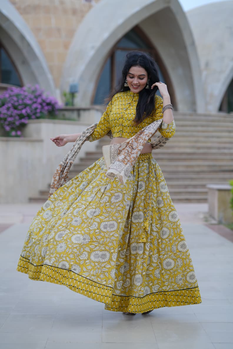Elevate your ethnic wardrobe with this exquisite hand block printed crop top and skirt set from Blockart. Crafted with precision and care, this set features intricate floral patterns on a mustard yellow backdrop. The high-quality cotton fabric ensures comfort and breathability, perfect for festive occasions. Embrace the artistry of Indian craftsmanship with this traditional ensemble.