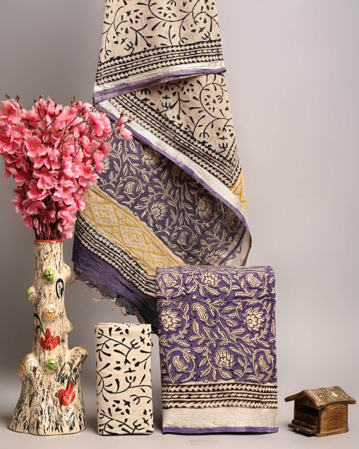 Experience the timeless elegance of Bagru hand block printed linen cotton suit set with a touch of mustard floral charm. Crafted with care, this set includes a linen cotton top, dupatta, and cotton bottom. The intricate silver border adds a subtle hint of sophistication to your ethnic wardrobe. Embrace comfort and style with this artisanal creation.