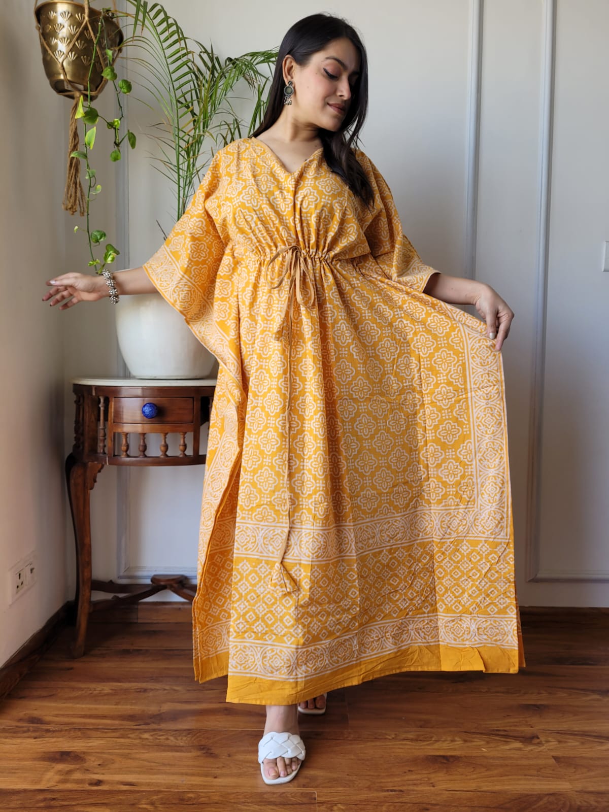 Indulge in the artistry of hand block printing with our Mustard Floral Print Cotton Kaftan Dress. Crafted from 100% pure cotton, this free-size dress features a V-neckline, drawstring waist, and flowy sleeves. The intricate white floral and geometric print adds an ethnic charm, while the border print detailing enhances its artisanal appeal. Experience comfort and style in this premium, handcrafted garment.