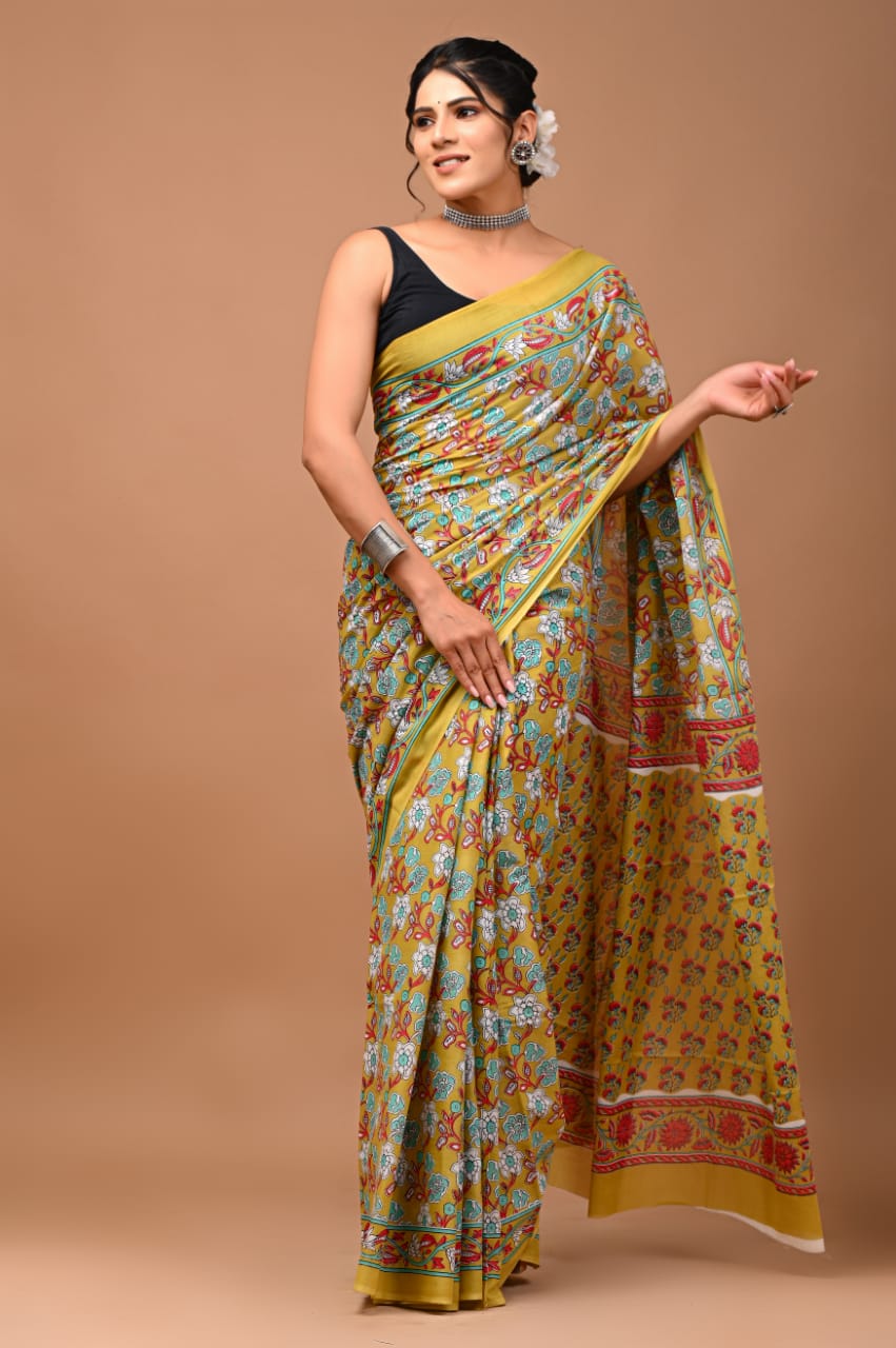 Elevate your ethnic wardrobe with our exquisite Mustard Floral Vine Hand Block Mulmul Cotton Saree. Crafted with care, this saree features intricate floral and vine hand block print design in vibrant shades of red, white, blue, and green. The lightweight and flowy mulmul cotton fabric ensure comfort all day long. The contrasting border and detailed pallu add a touch of elegance to this traditional piece. Perfect for special occasions or casual wear.