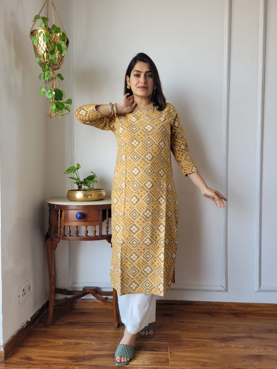 Elevate your wardrobe with the Mustard Geometric Bloom Cotton Kurti Set, a versatile and stylish addition that embodies the essence of Indian craftsmanship and modern design.