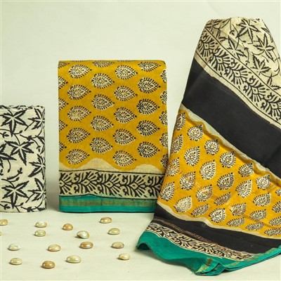 Mustard Leaf Hand Block Print Chanderi Silk Dress Material Set