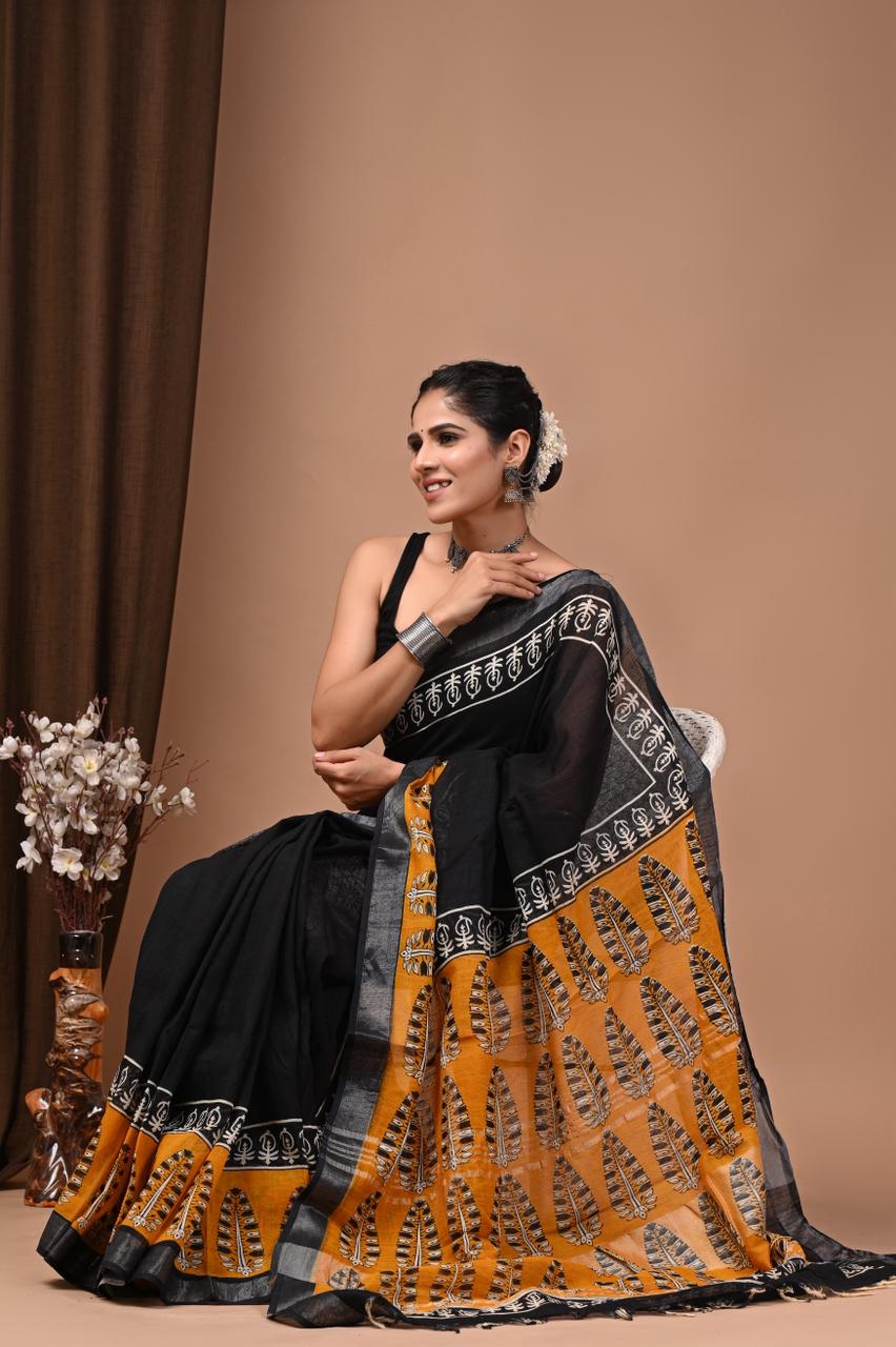 Indulge in the timeless elegance of hand block printing with our Mustard Leaf Motif Linen Saree. Crafted from premium linen fabric, this saree features intricate leaf-like patterns in black and white on a mustard yellow base, exuding traditional charm. The black border and detailed pallu add a touch of sophistication. Experience comfort and style in every drape with this artisanal piece. Perfect for special occasions or everyday wear.