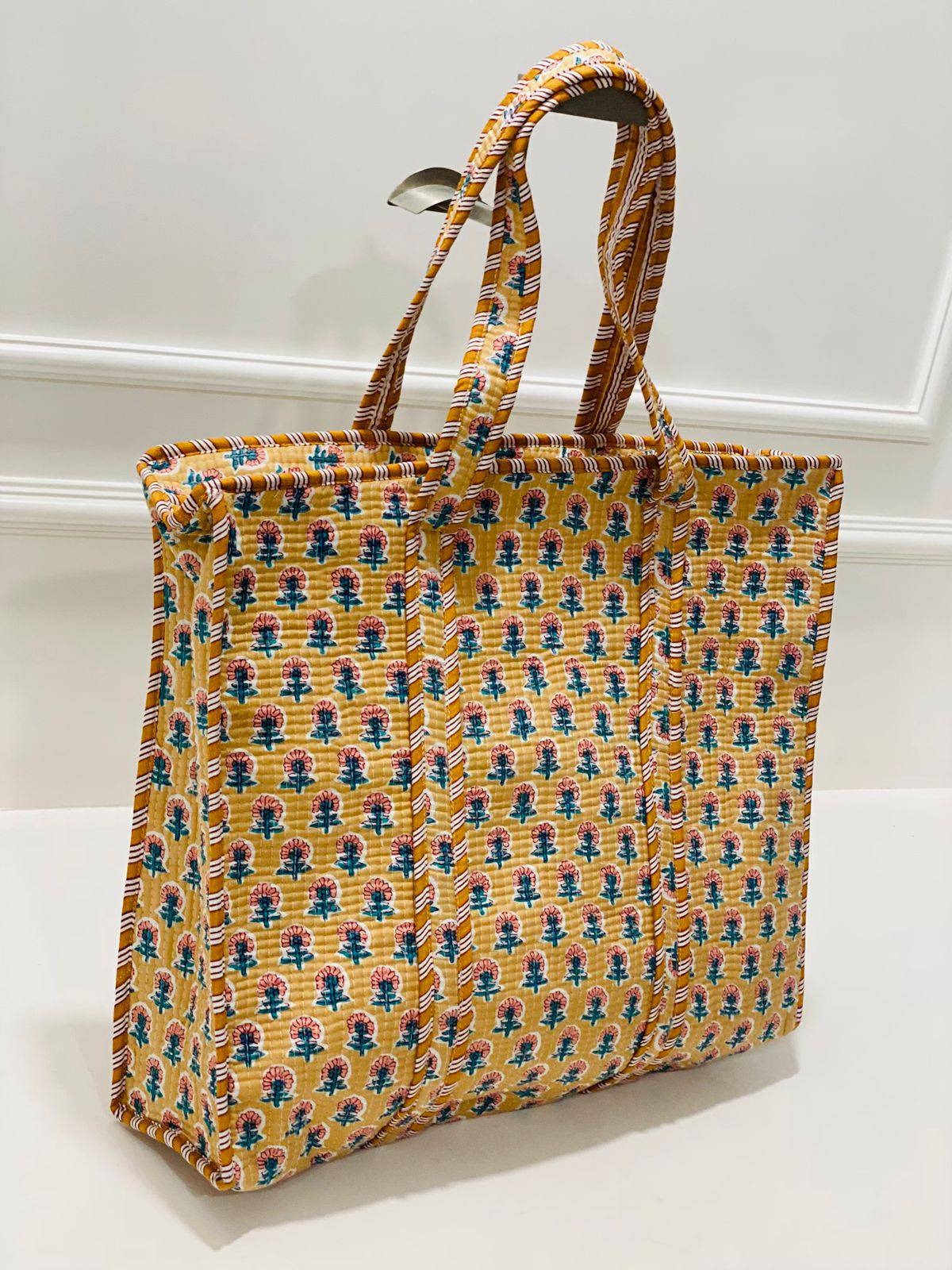 Embark on a journey through the Mustard Meadow with this exquisite quilted cotton tote bag adorned with a floral splendor. The mustard yellow base complements the pink and green flowers, while the striped pattern on the edges and handles adds a touch of elegance. The artisan techniques shine through the visible stitching, enhancing the texture and durability of the bag. Perfect for carrying multiple items, this bag not only adds a vibrant charm to your ensemble but also offers practical benefits with its spacious design. Feel the connection to Indian craftsmanship as you carry this unique piece, crafted with attention to detail and lasting wear in mind.