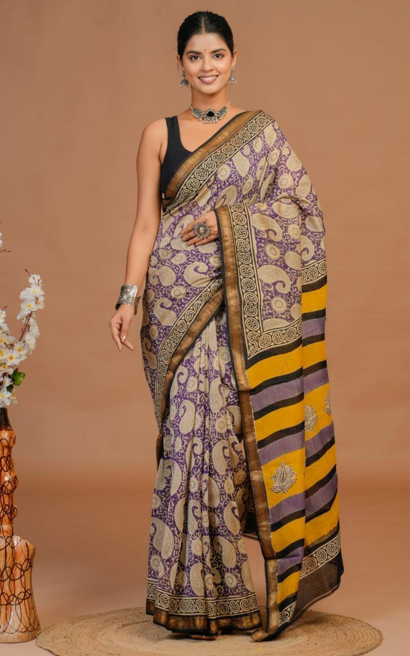 Wrap yourself in elegance with our Mustard Paisley Silk Saree with Beige Floral Border. Crafted from luxurious silk, this saree features traditional paisley and floral motifs on a regal purple base, complemented by an intricate black border with circular designs. The striking pallu showcases contrasting horizontal stripes in mustard yellow, purple, and black, adorned with additional beige motifs. The hand block printing process adds an artisanal touch, making each piece unique. This saree drapes gracefully, offering both comfort and sophistication.