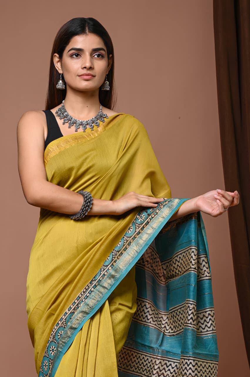 When you’re looking for a piece that radiates both tradition and contemporary flair, this saree offers the ideal blend. The rich mustard base, adorned with striking teal geometric patterns, creates a delightful visual dance that catches the eye.