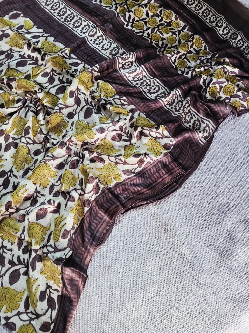 Immerse yourself in the artisan's vision with this handcrafted Modal Silk Saree. Inspired by traditional printing techniques, the saree features a stunning floral and leaf pattern in mustard yellow, brown, and maroon on a creamy base. The lightweight, silky fabric offers a luxurious feel while being breathable and comfortable. Style this saree in multiple ways to elevate your ethnic look while honoring India's cultural heritage.