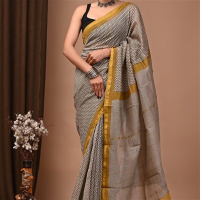 Elevate your ethnic wardrobe with our exquisite Mustard Zigzag Chanderi Silk Saree. Handcrafted with precision using traditional hand block printing techniques, this saree features a striking black and white zigzag pattern on the main body, complemented by a checkered pallu with a mustard yellow border. The lightweight and sheer chanderi silk fabric ensures comfort without compromising on style. Perfect for cultural events and festive occasions, this saree comes with a matching printed blouse piece for a complete look.