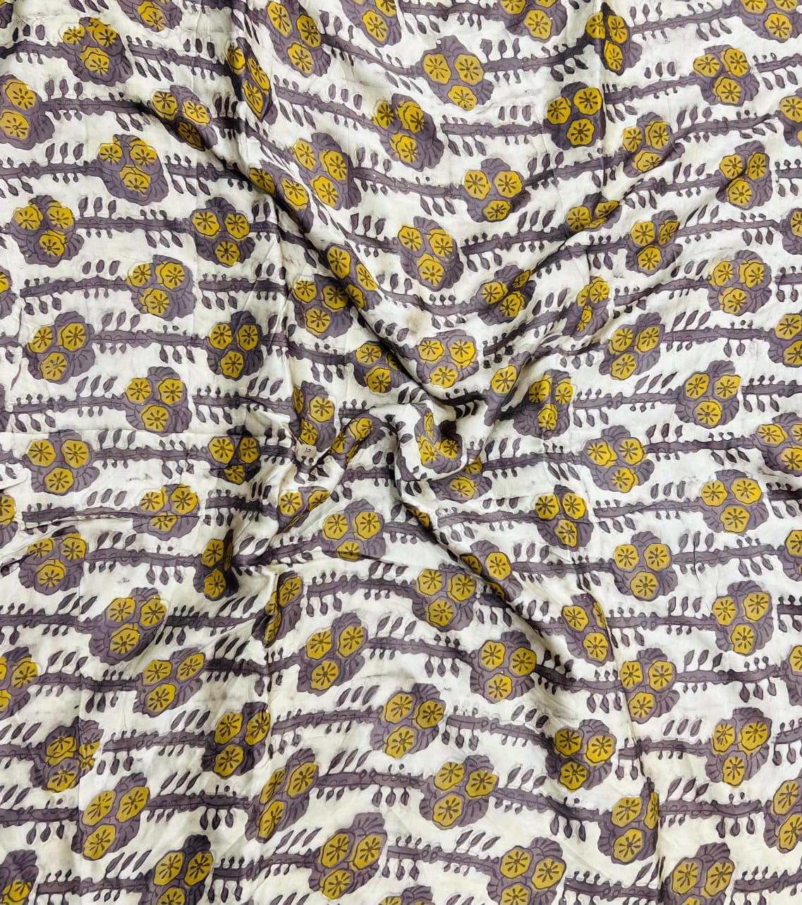Isn’t it frustrating to find textiles that don’t embody the spirit of artistry? This muted lavender floral fabric offers a refreshing solution, capturing the essence of traditional craftsmanship in each thread. The soft, creamy white backdrop harmonizes beautifully with vibrant mustard yellow blooms and subtle grey leaves, creating a design that feels both unique and inviting.
