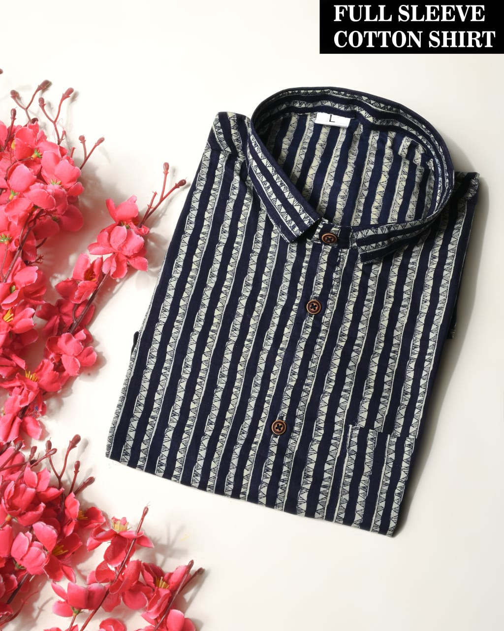 Add a touch of sophisticated charm to your wardrobe with this stylish men's full sleeve cotton shirt. The shirt features a classic striped design in navy blue and off-white, each off-white stripe adorned with a fine geometric Leheriya print. This traditional hand-block printing technique from Rajasthan creates a unique and intricate wavy pattern within the stripes, giving the shirt a refined yet handcrafted feel. Made from 100% pure cotton, the fabric is exceptionally soft and breathable, ensuring superior comfort throughout the day. The full sleeves and classic collar give it a versatile and timeless look, making this a perfect choice for various occasions, from a casual day at the office to a relaxed weekend outing. Pair it with light-colored chinos or denim to create a polished look that highlights the intricate print. This comfortable and fashionable shirt is a perfect blend of traditional craftsmanship and contemporary style.