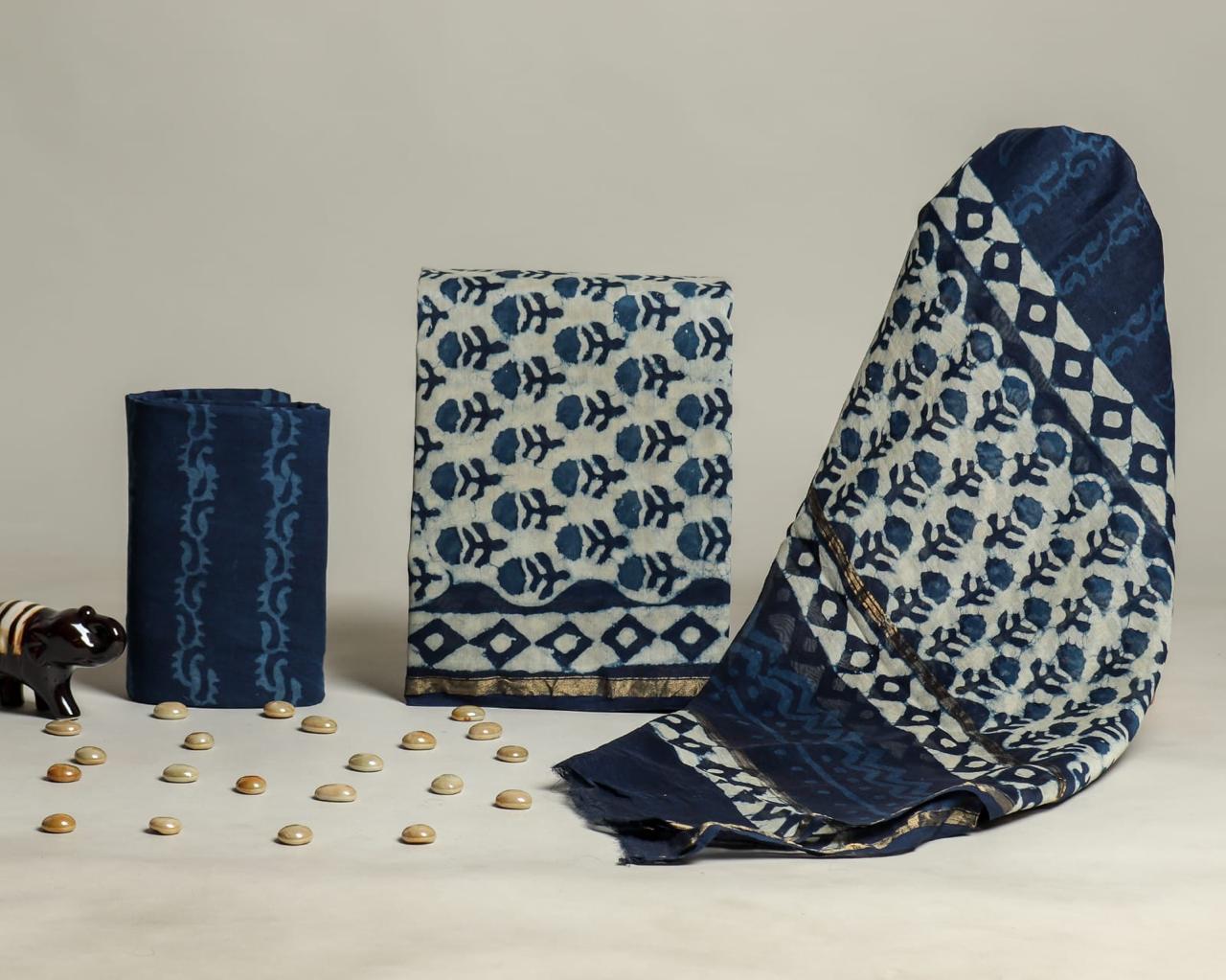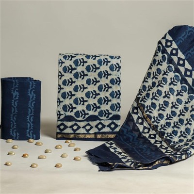 Indulge in the exquisite art of hand block printing with this premium chanderi silk ensemble from Blockart. Crafted with care and precision, this set includes a chanderi silk top and duptta paired with a comfortable cotton bottom. The ensemble features a captivating navy blue floral pattern with subtle lighter blue motifs, complemented by intricate geometric borders. Embrace elegance and tradition effortlessly with this handcrafted masterpiece.