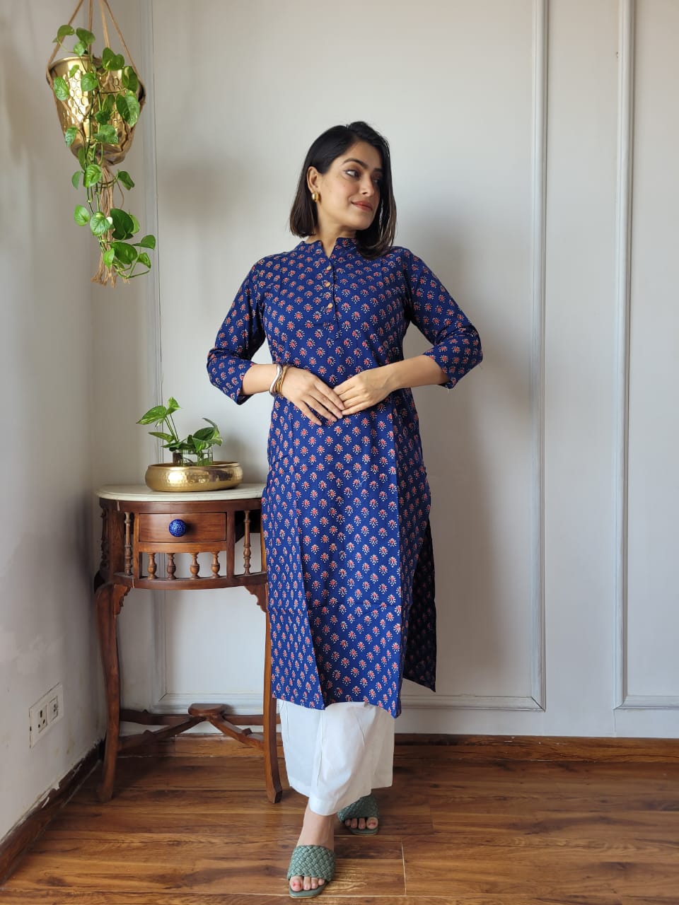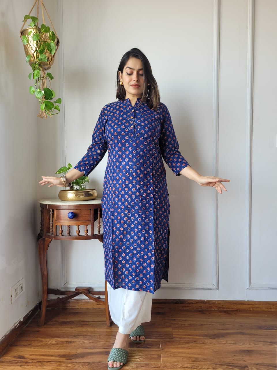 Step into elegance with our navy blue floral paisley cotton kurta, exquisitely designed for the modern woman. Made from lightweight, breathable cotton, this kurta features a mandarin collar, three-quarter sleeves, and side slits for ease of movement. The intricate floral and paisley pattern adds a touch of traditional charm to your ensemble. Perfect for casual outings or semi-formal events, this kurta offers both style and comfort. Pair it with white pants for a chic look or mix and match for versatile styling options. Carefully crafted with attention to detail, this kurta is a timeless piece that will elevate your wardrobe effortlessly.