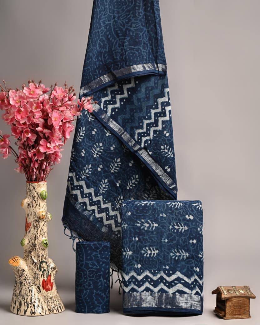 Elevate your ethnic wardrobe with this exquisite Navy Blue Linen Cotton Suit Set featuring intricate hand block printing. Crafted with premium quality fabric, this set exudes elegance and comfort. The top and dupatta showcase floral and geometric patterns, enhanced by a silver border for a touch of sophistication. The bottom fabric complements the set, making it perfect for traditional occasions.