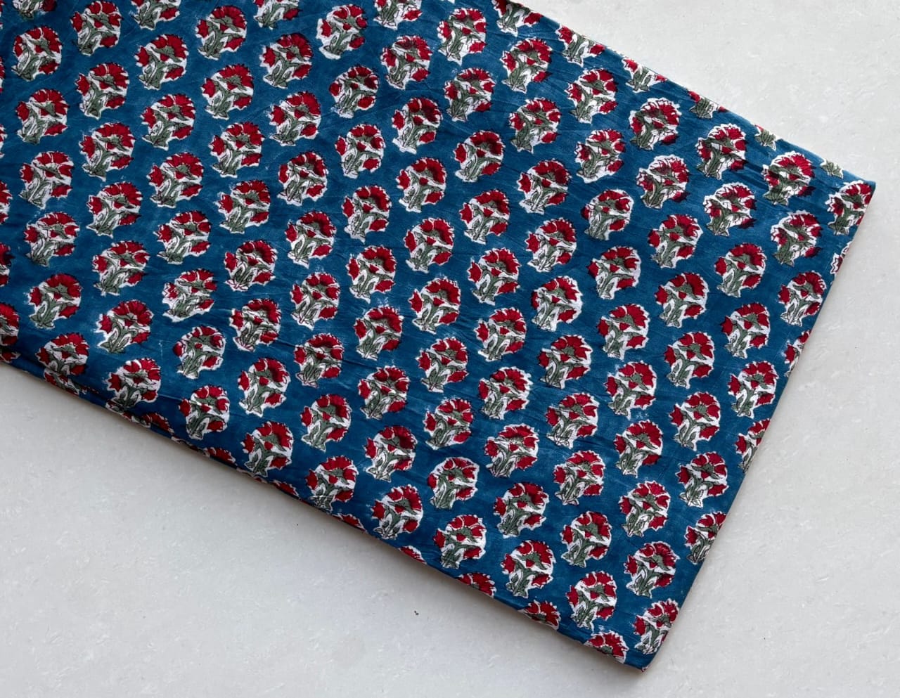 The lush crimson flowers dance across the navy background, their delicate details a testament to the artisan’s craft. Each motif is meticulously placed, reflecting the timeless elegance of hand block printing. There's a sense of rhythm in the design, creating a visual flow that draws the eye.