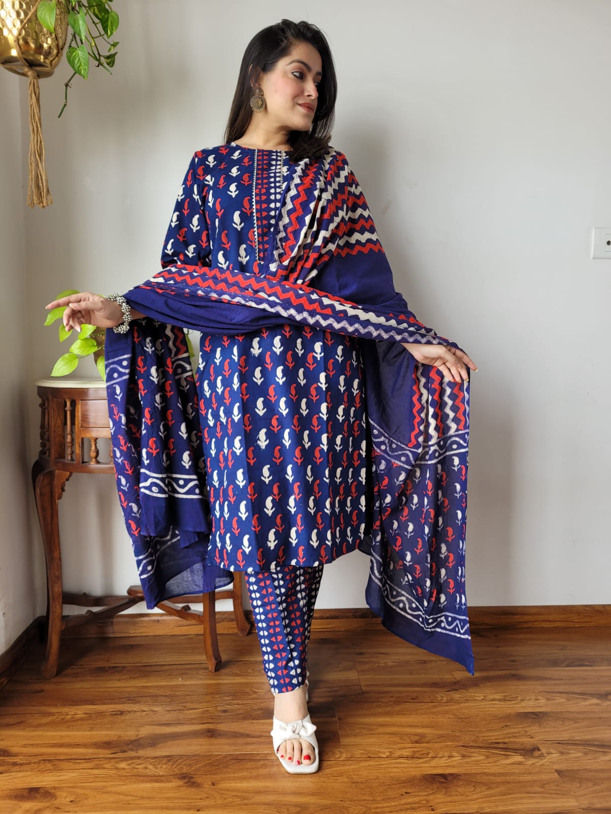 Rooted in the sophistication of Indian artistry, the navy crimson floral geometric cotton suit set showcases exquisite hand block prints that dance across the fabric. Each motif tells a story, beautifully intertwining traditional craftsmanship with contemporary aesthetics.