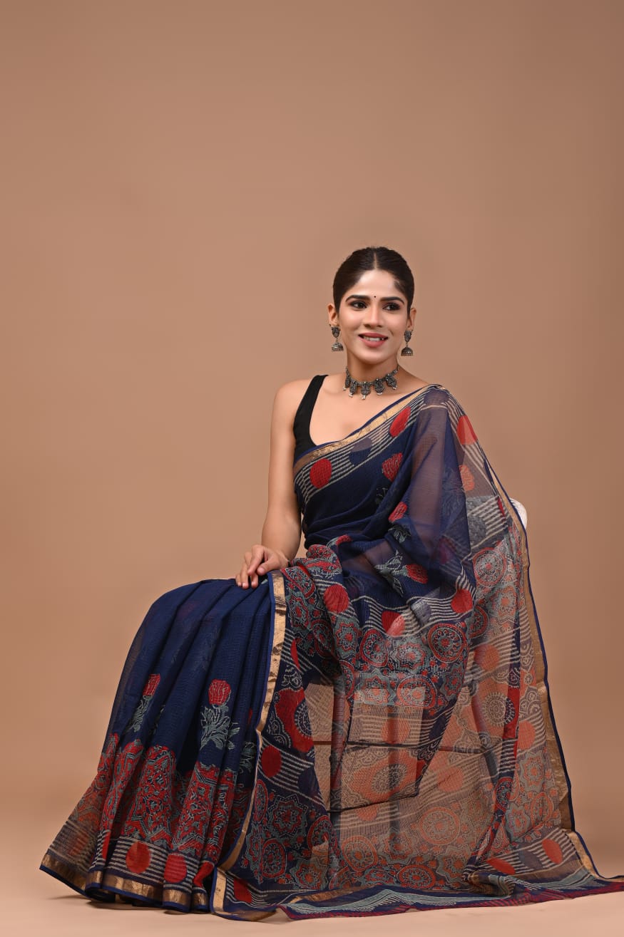 Searching for a textile that merges tradition with modern flair? This elegant Kota Doria saree features a deep navy base adorned with vibrant crimson floral motifs, creating a striking visual contrast. The intricate patterns are a testament to artisan craftsmanship, reflecting the rich heritage of Indian textiles.