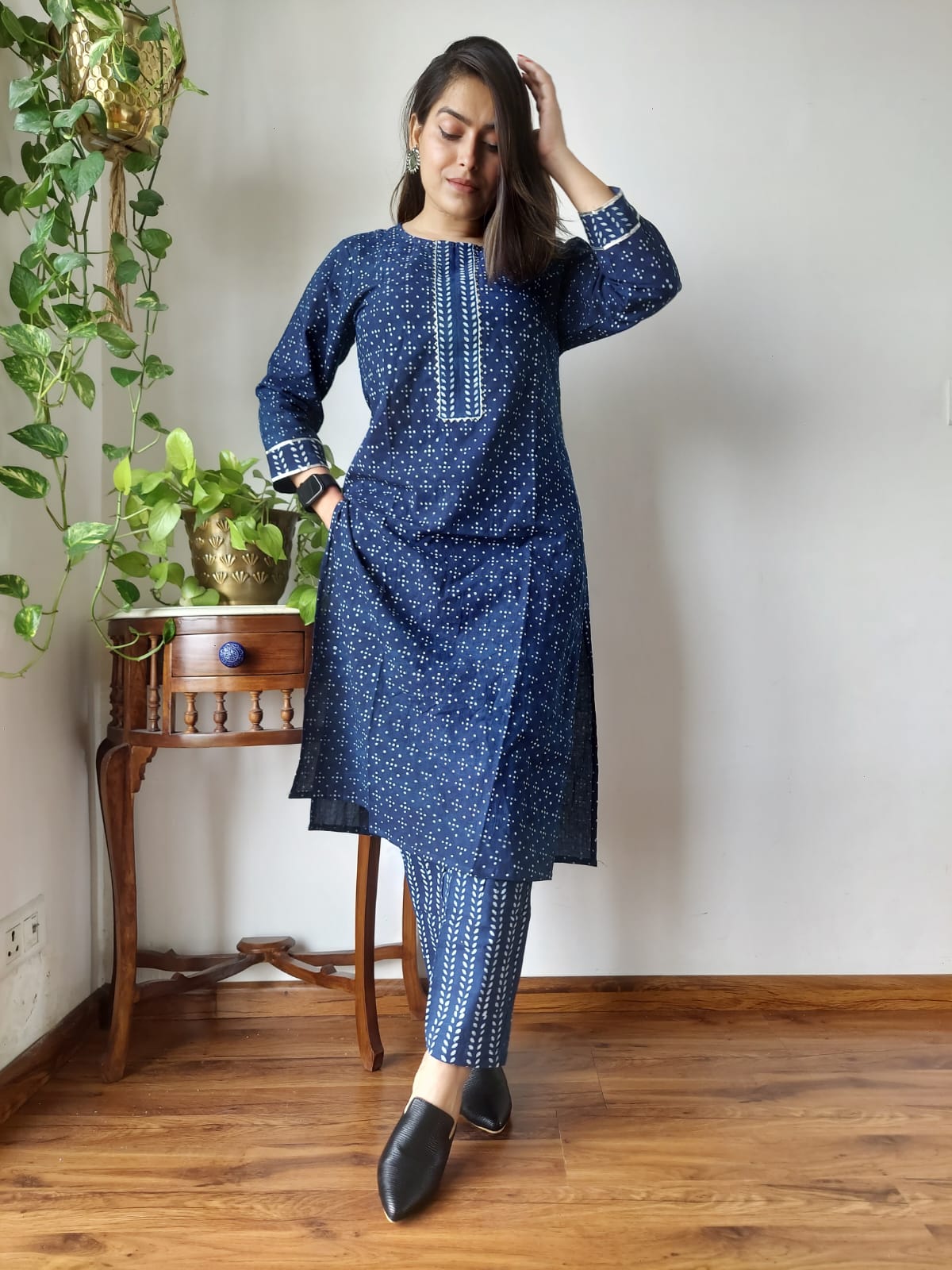 In a delightful interplay of contemporary design and traditional craftsmanship, this Navy Dot Harmony Cotton A-Line Kurti with Pant embodies the essence of Indian artistry. Made from soft, breathable cotton, it’s not just a piece of clothing but a celebration of intricate detailing and elegant silhouettes.