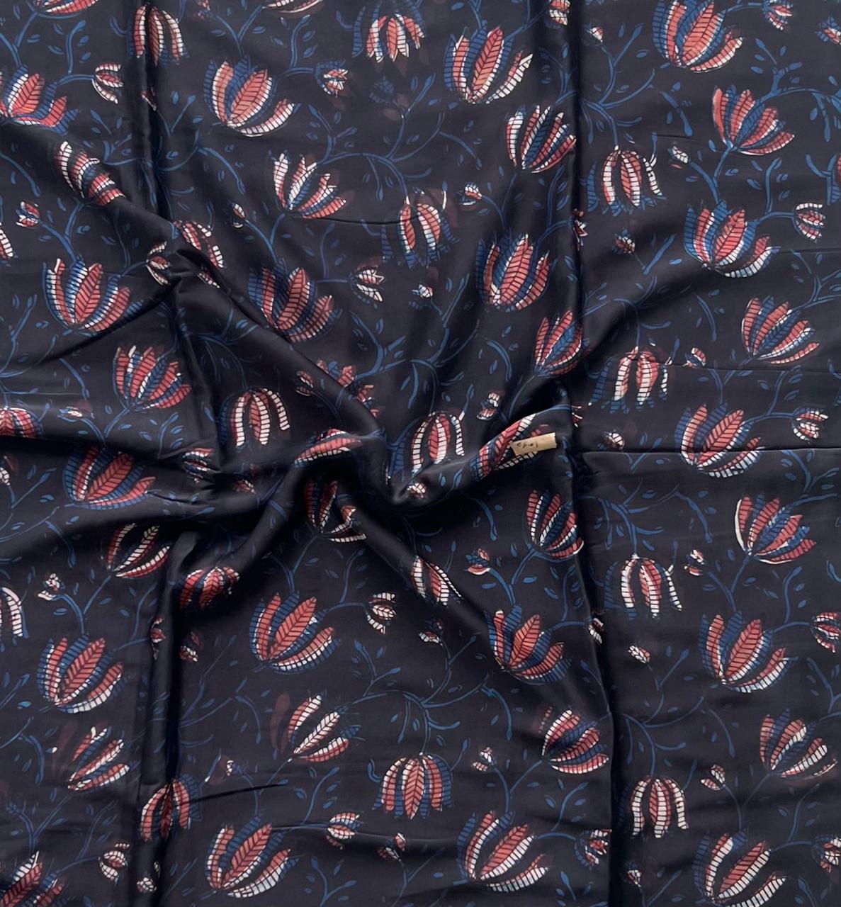 Immerse yourself in the rich heritage of Indian craftsmanship with our Navy Floral Breeze Block Print Modal Silk Fabric. This exquisite textile is adorned with delicate floral motifs, each intricately designed to bring a touch of nature’s elegance into your home or wardrobe. The lush navy backdrop serves as a canvas for blooms in deep crimson and soft coral, elegantly accented with muted teal leaves, creating an eye-catching yet harmonious balance.