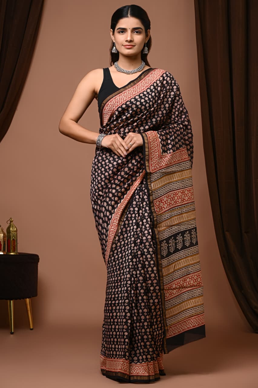 Are you looking for a piece that can seamlessly transition from daytime elegance to evening celebrations? Look no further. This stunning Bagru Hand Block Print Chanderi Silk Saree beautifully merges tradition with a fresh vibrancy. The rich navy blue base is a canvas for delicate blush pink floral motifs, creating a visual delight that catches the eye.