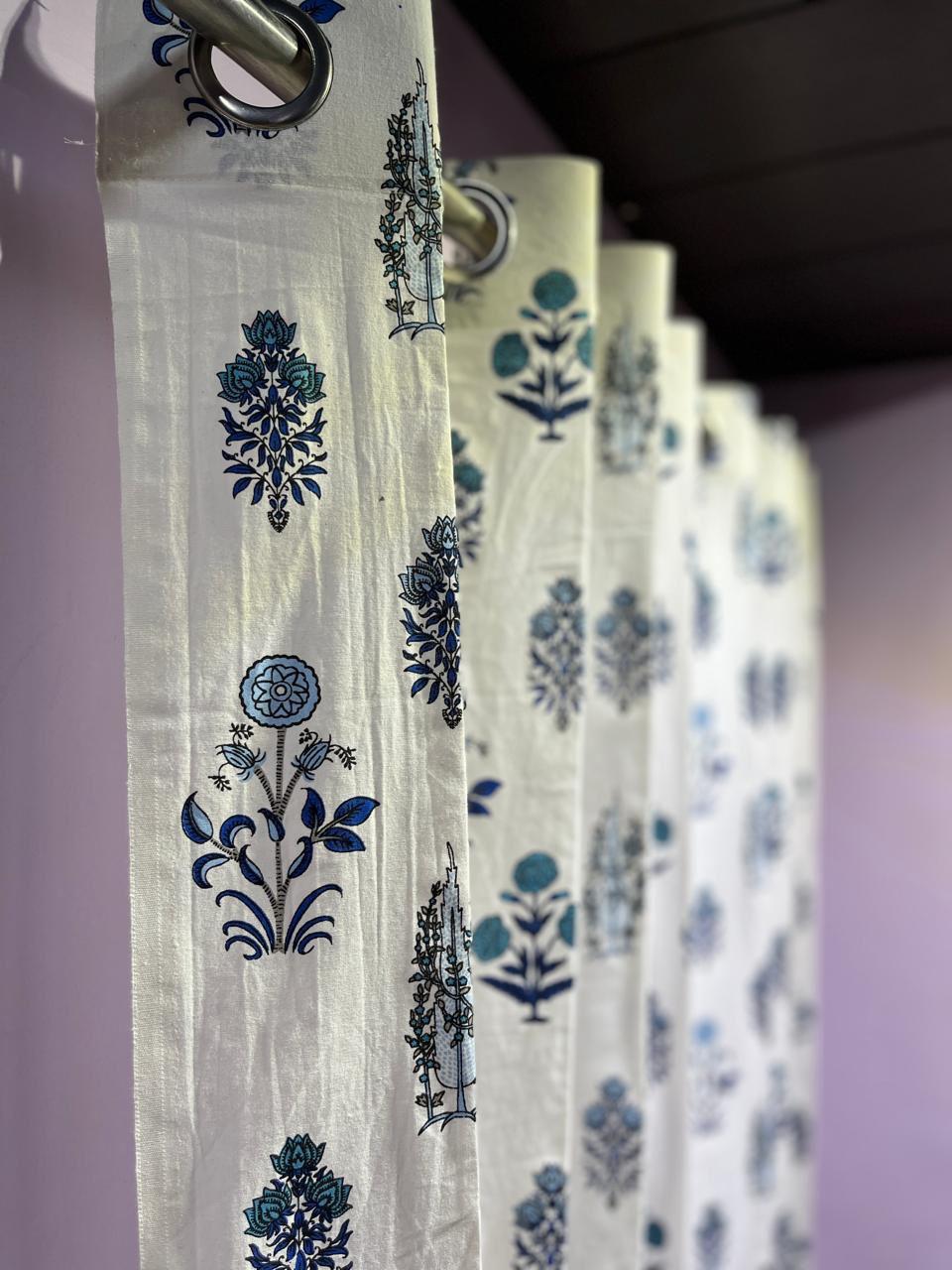 Infuse your living space with the timeless charm of our Navy Floral Delight Block Print Cotton Curtains. Drawing inspiration from India's rich textile traditions, these curtains showcase an exquisite floral design that captures the essence of artisanal craftsmanship. The intricate motifs dance gracefully across a gentle ivory backdrop, creating a striking visual contrast that invites warmth and elegance into your home.