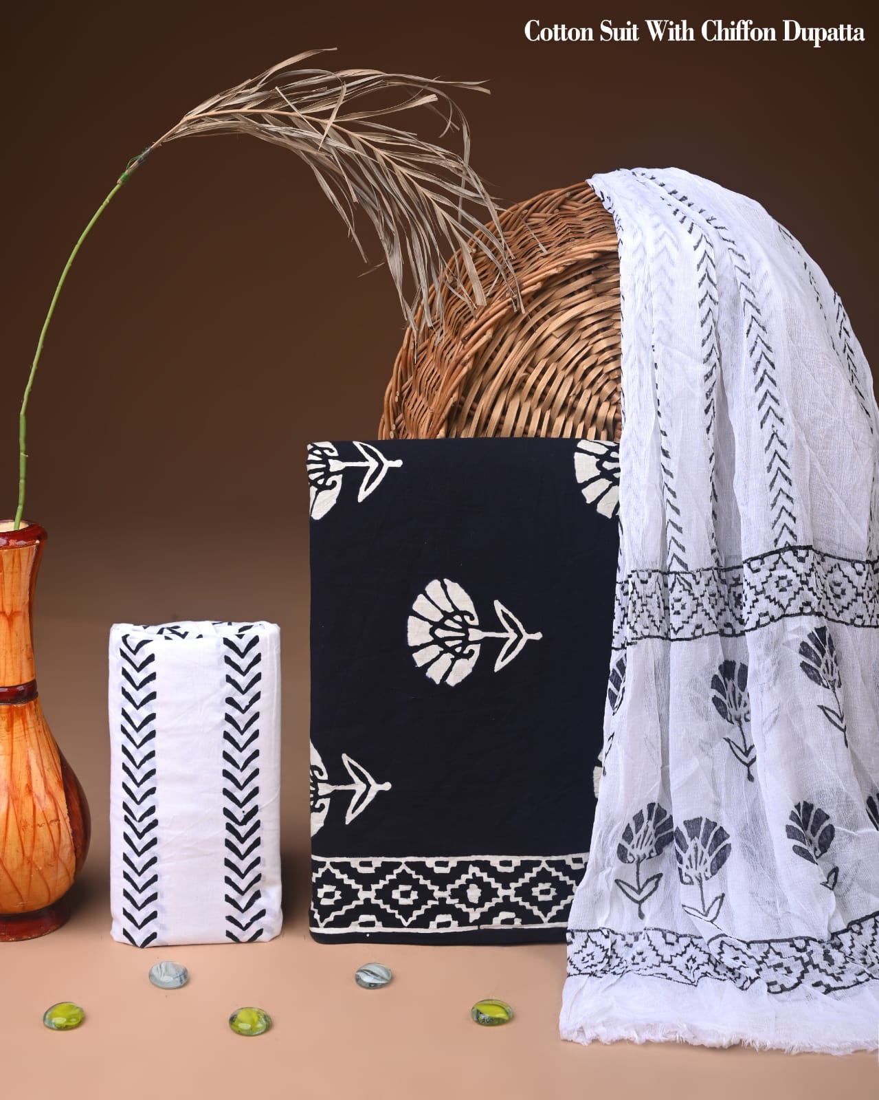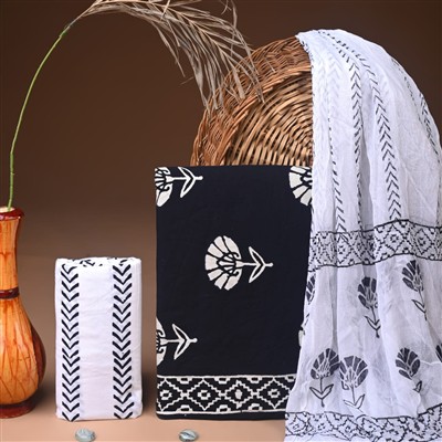 Rooted in the vibrant heritage of Indian craftsmanship, this exquisite cotton suit set showcases a deep navy canvas adorned with delicate ivory floral motifs. A true testament to artisanal dedication, the intricate hand block printing technique brings each design to life, echoing the timeless traditions of textile artistry.