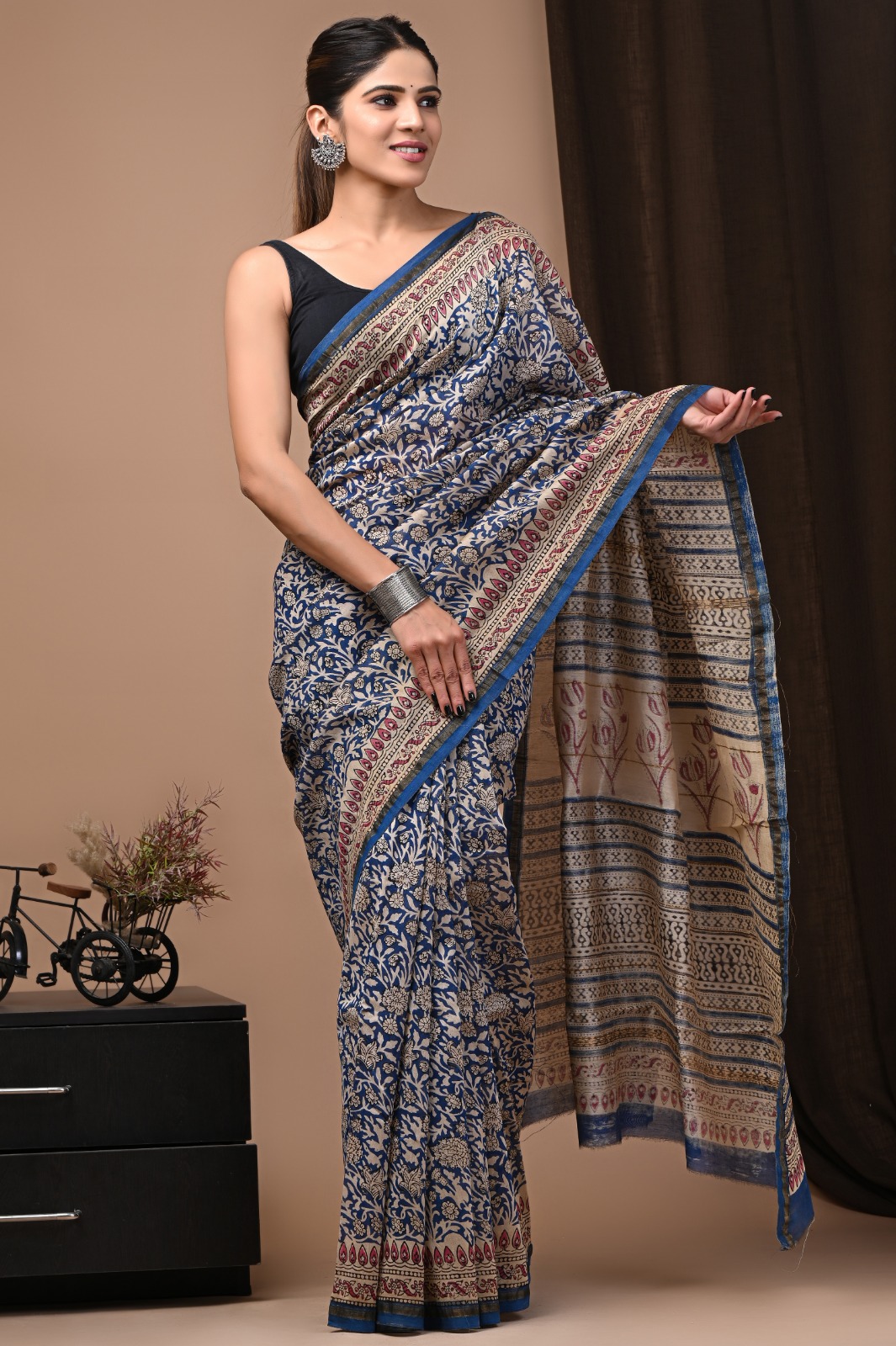Step into a world where intricate artistry meets contemporary charm with our Navy Floral Elegance Chanderi Silk Saree. This exquisite piece draws inspiration from the time-honored traditions of Bagru, boasting a stunning interplay of deep navy hues adorned with delicate floral motifs that dance across the fabric. Each design element, carefully hand-block printed, reflects the rich heritage of Indian craftsmanship.