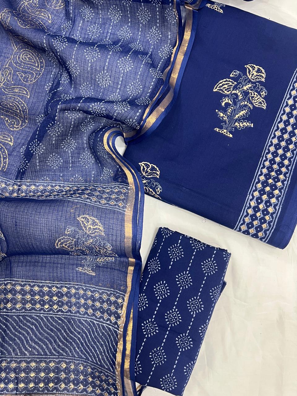 Celebrate the artistry of Indian textiles with our Navy Floral Elegance Kota Doria Dress Material. This exquisite fabric seamlessly marries intricate floral motifs with geometric designs, showcasing a deep navy canvas enriched with gold accents. The lightweight, airy texture offers both comfort and sophistication, making it a delightful choice for any occasion.