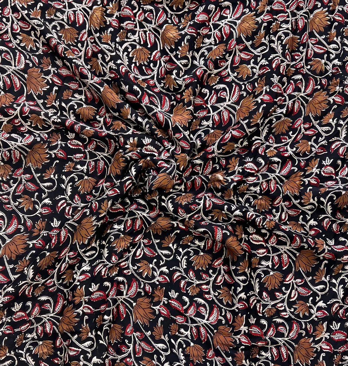 Delve into the essence of Indian artistry with our Navy Floral Elegance Modal Silk Fabric. This exquisite textile showcases a dark navy canvas adorned with intricate floral motifs in burnt sienna and vibrant crimson, enveloped in soft ivory detailing. Each swirl of vine and bloom reflects centuries of traditional craftsmanship, expertly block printed to perfection.