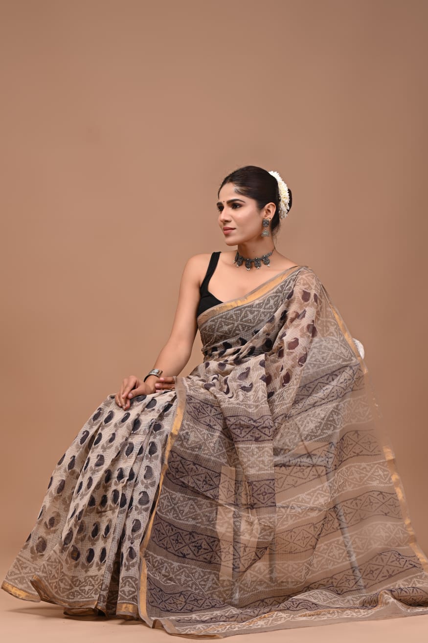 As you drape this beautiful piece, feel the gentle caress of the soft Kota cotton against your skin, ensuring you stay cool and comfortable. The airy nature of the fabric allows for graceful movement, effortlessly transitioning from day to night.