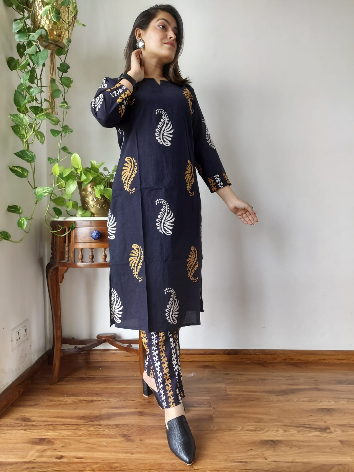 In need of a fresh style that radiates elegance while honoring the charm of Indian craftsmanship? Our Navy Floral Harmony ensemble beautifully pairs a flowing A-line kurti with comfortable pants, creating a harmonious silhouette. The rich navy fabric, adorned with vibrant yellow floral motifs, captures the essence of artisanal block printing techniques, ensuring each piece is unique. The smooth cotton drapes gently over the body, creating a relaxed fit that's perfect for a day out or a casual gathering.