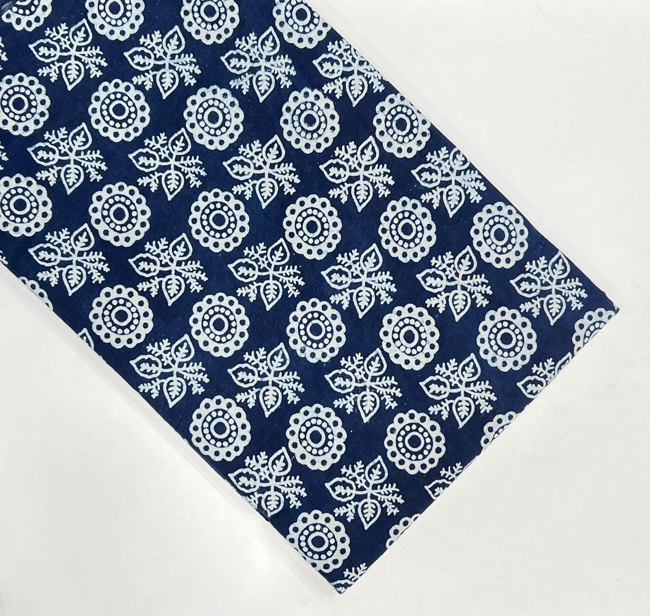 Immerse yourself in the rich tapestry of Indian textile traditions with our Navy Floral Harmony Cotton Running Fabric. The deep navy base is adorned with charming floral motifs, crafted through the meticulous technique of Bagru hand block printing. Each pattern tells a story, reflecting the artistry and heritage of skilled artisans.