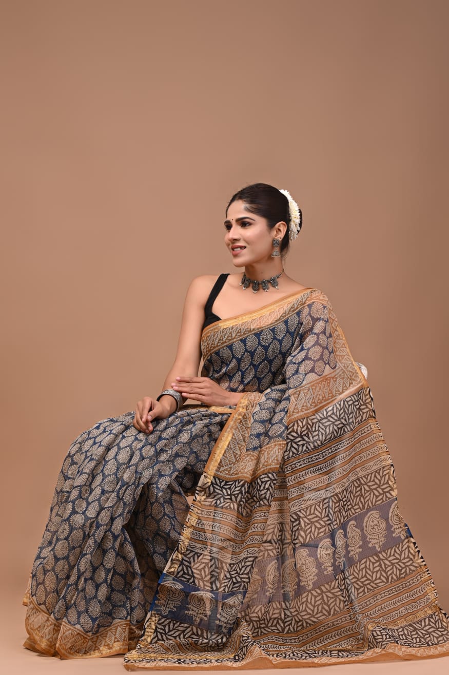 Its lightweight and airy nature ensures a comfortable drape, perfect for those warm days. The intricate hand block prints, steeped in tradition, create a visual narrative that speaks to the craftsmanship of talented artisans. Each motif reflects meticulous attention to detail, while the elegant silk border adds a refined finish, elevating your look effortlessly.