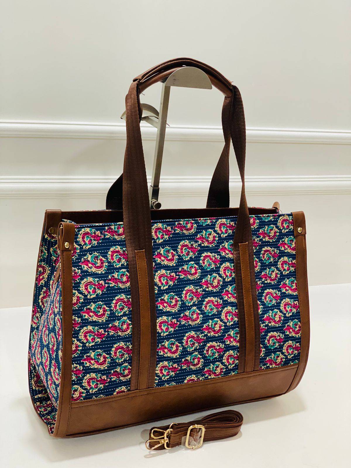 Are you looking for a striking blend of artistry and practicality? This navy floral swirl cotton office bag is designed for those who appreciate the beauty of handcrafted textiles. With its vibrant floral motifs in crimson, bright pink, and mustard yellow, it adds a delightful pop of color to any outfit.