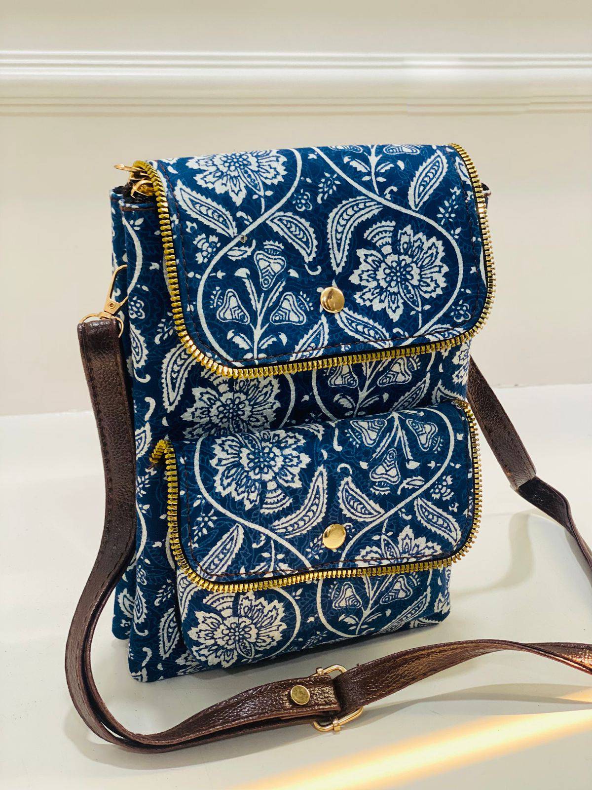 Step into a world where tradition meets contemporary flair with the Navy Floral Symphony Cotton Sling Bag. This exquisite piece showcases a rich navy backdrop adorned with delicate white floral patterns, intertwining paisley motifs that echo the beauty of Indian artistry. Crafted using the age-old block printing technique, each bag is a unique testament to the skill and passion of our artisans.