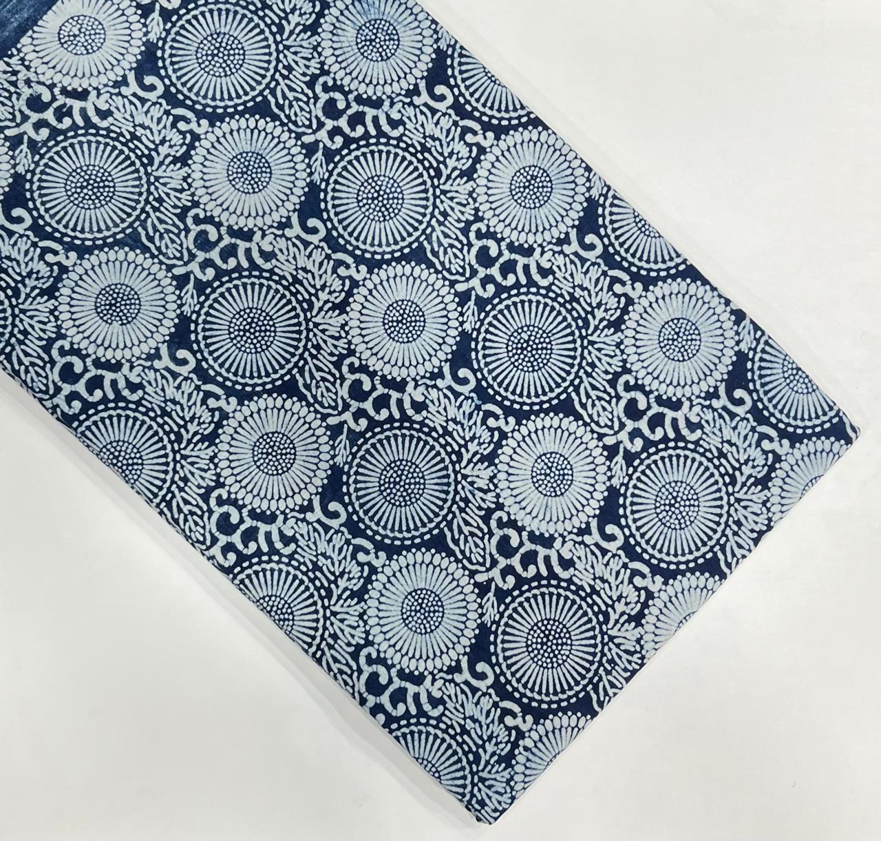 Embodying the essence of Indian artistry, our Navy Floral Whispers Cotton Running Fabric is a tribute to the age-old technique of hand block printing. The rich navy backdrop serves as a canvas for intricate floral designs, bringing forth an enchanting interplay of nature and craftsmanship.