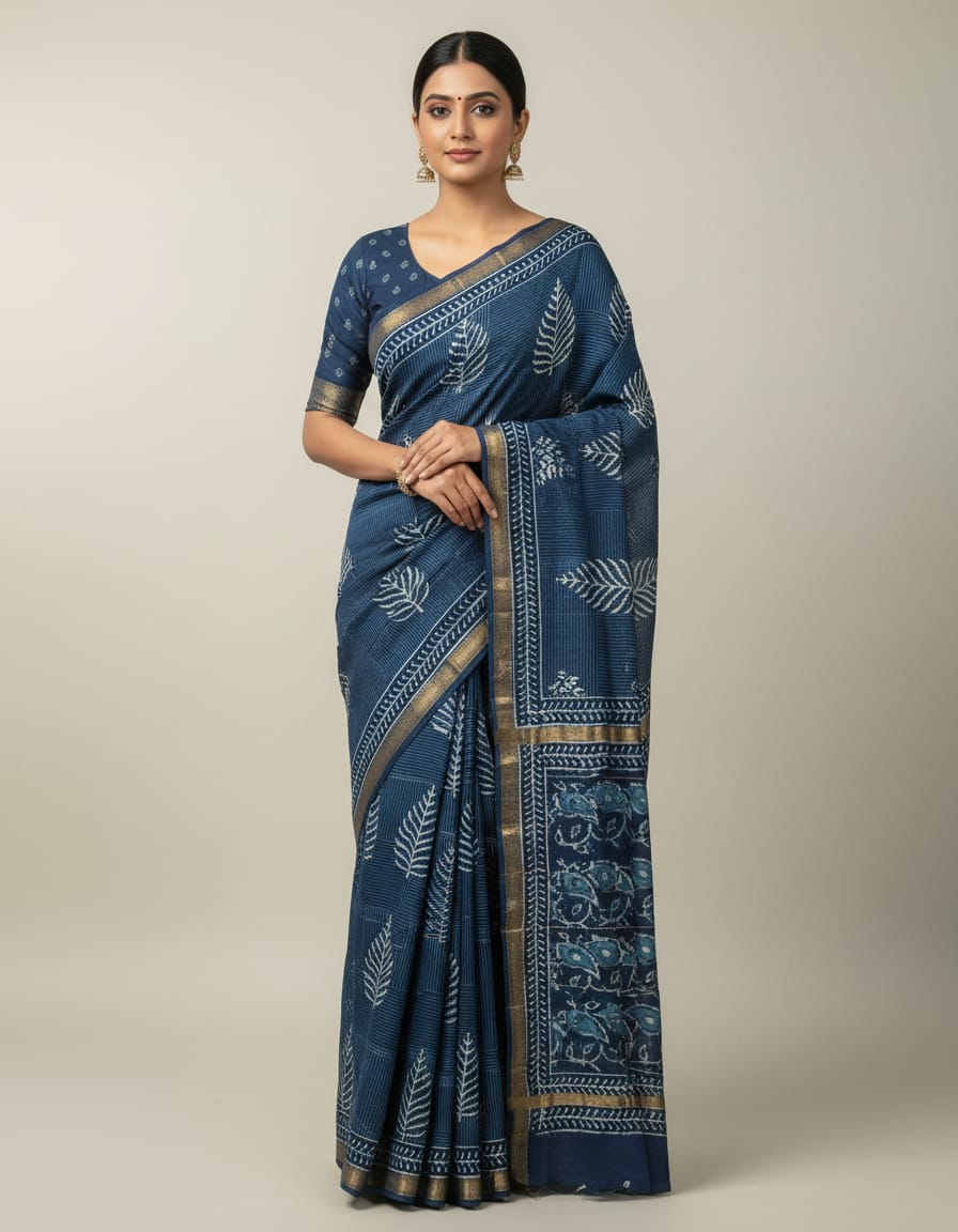 In a delicate dance of navy and sky blue, this saree tells a story of artisanal craftsmanship grounded in the rich traditions of Indian textile art. The intricate floral and geometric patterns, meticulously hand block printed, breathe life into each fold, inviting you to celebrate the beauty of authenticity.