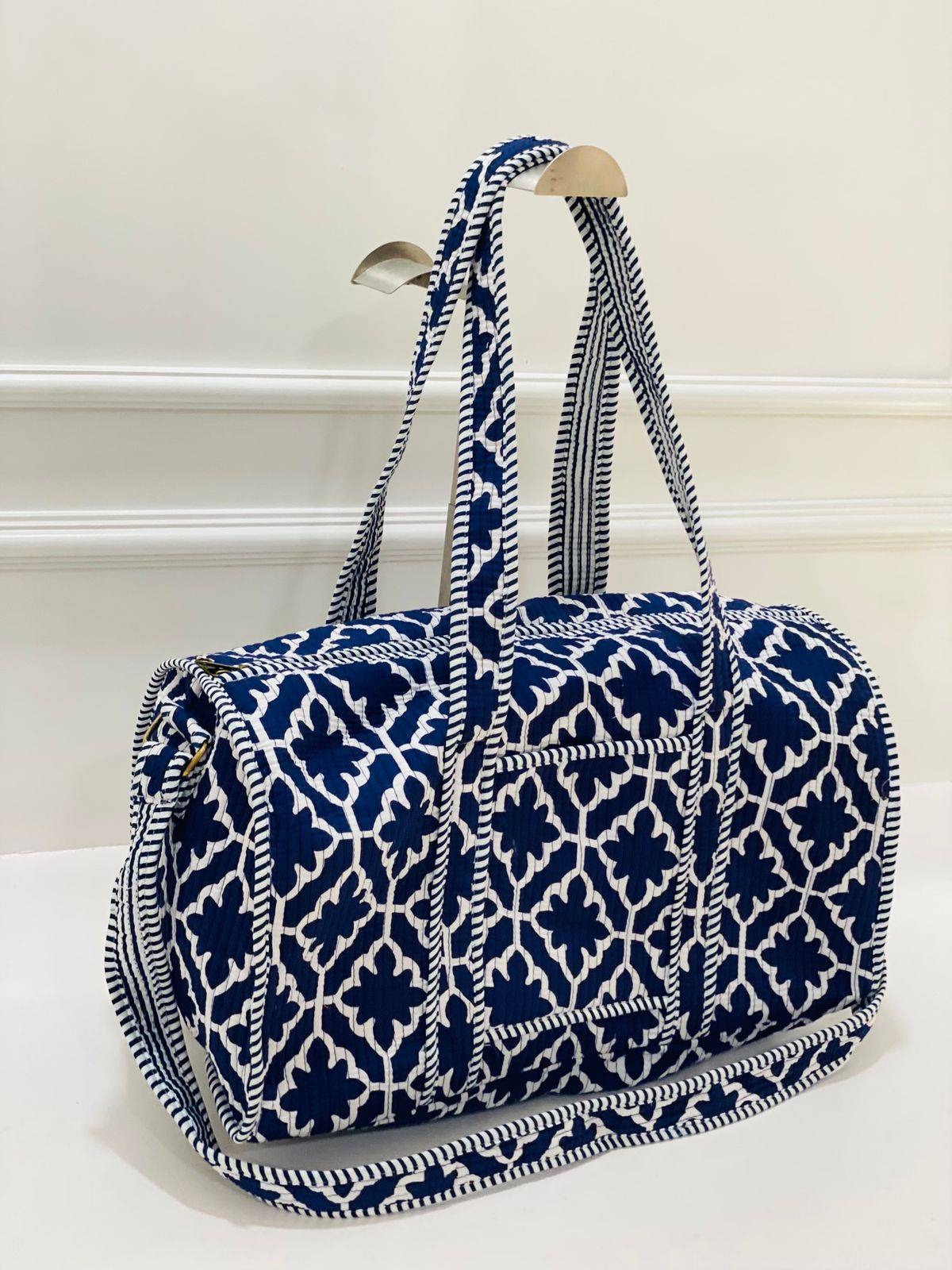 Embrace the charm of this Navy Geometric Floral Quilted Duffle Bag in a soft cotton blend. The intricate white floral pattern on a navy blue background exudes elegance and style. The artisan techniques of hand block printing add a touch of traditional craftsmanship to this modern accessory.