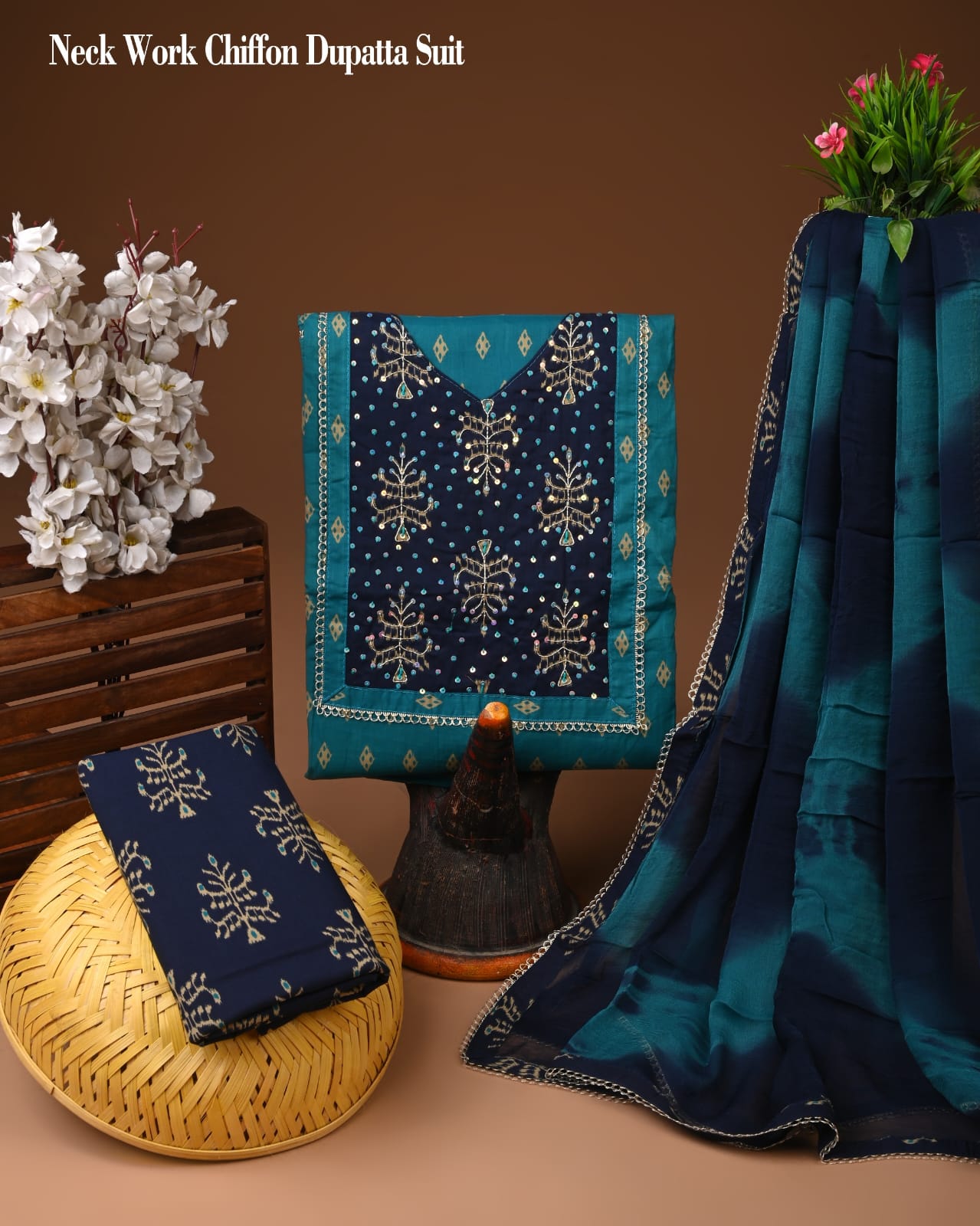 This set is not just an outfit; it’s a canvas that celebrates the rich heritage of Indian craftsmanship. The breathable cotton fabric ensures lasting wear, while the lightweight chiffon dupatta adds an ethereal touch, allowing for graceful movement.