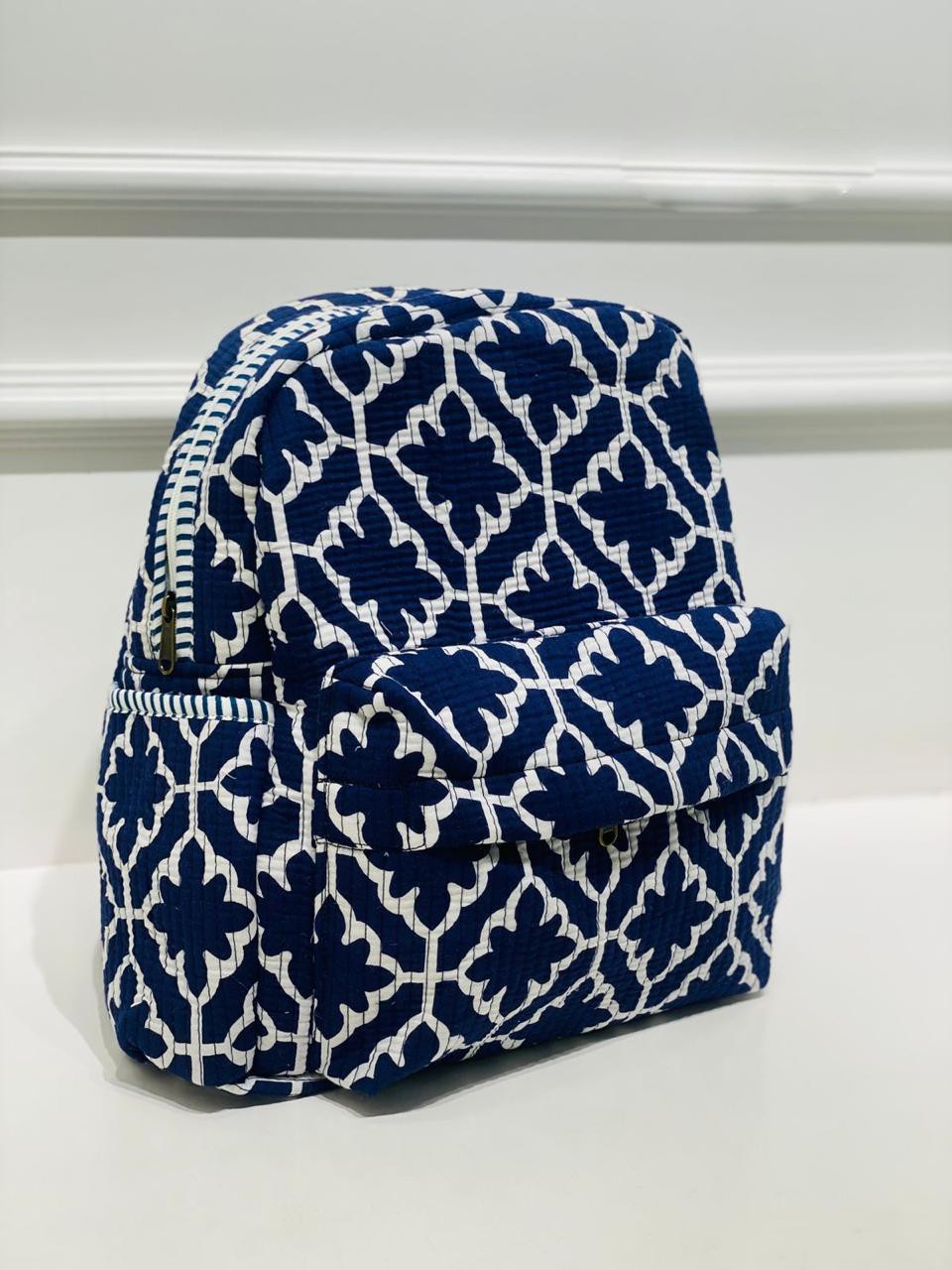 Discover a harmonious blend of tradition and modernity with our Navy Geometric Medley Quilted Backpack. This exquisite piece features a stunning array of interlocking floral motifs set against a deep navy backdrop, showcasing the artistry of hand block printing. Its elegant design brings a touch of sophistication to your daily adventures.