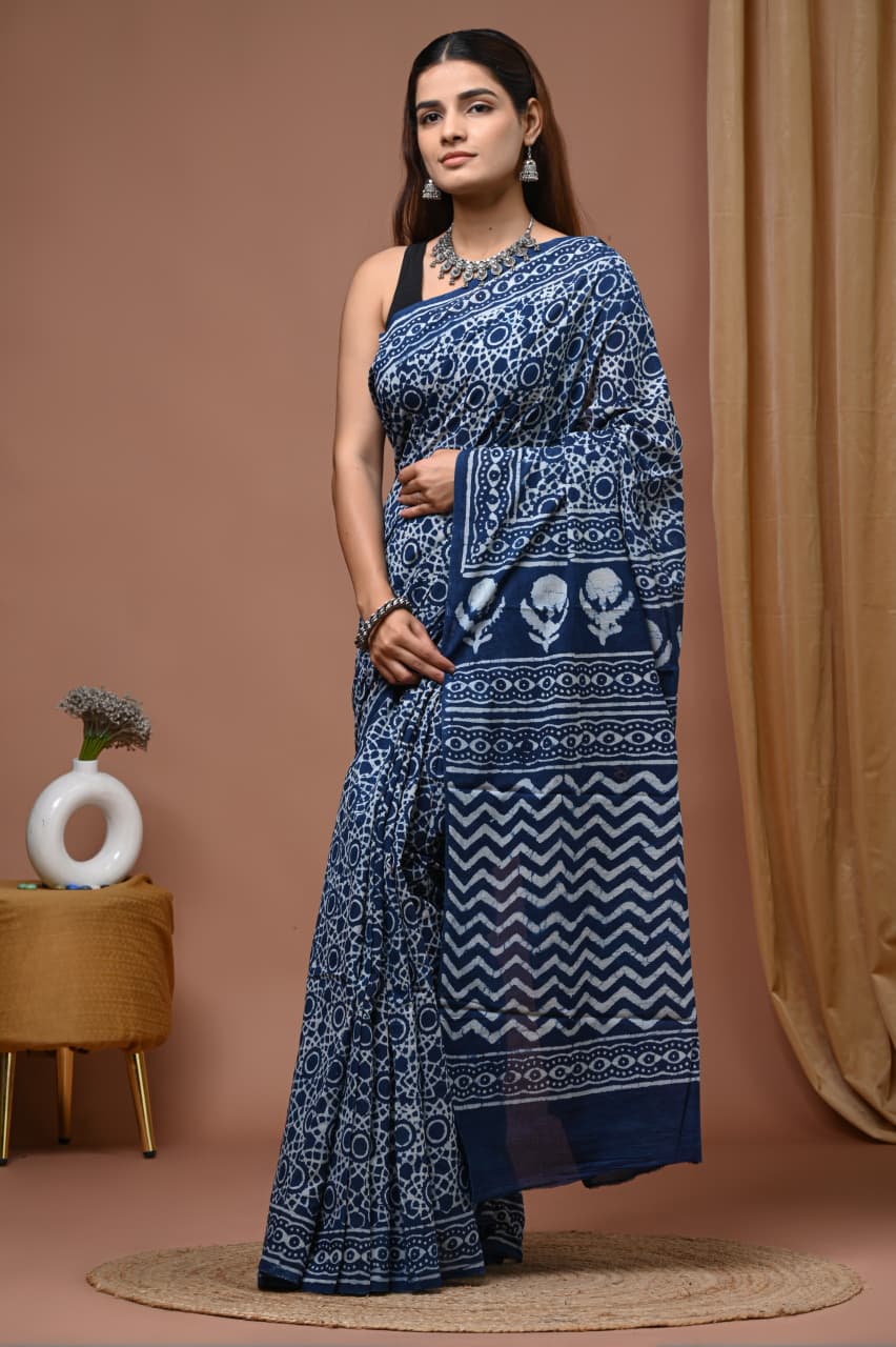 Navy Indigo Floral Hand Block Mulmul Cotton Saree