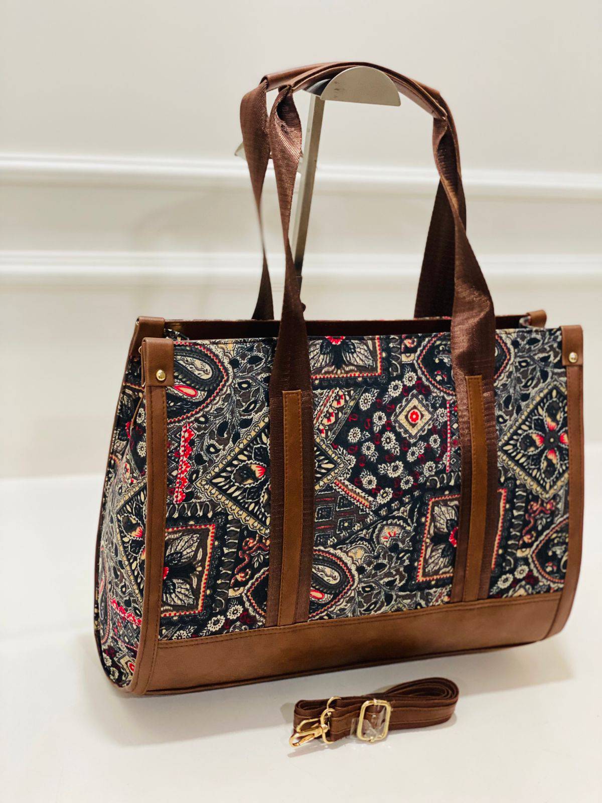Style it with a crisp white shirt and tailored trousers for an office-ready look, or pair it with your favorite casual ensemble for a weekend outing. The versatile design, complemented by sturdy brown faux leather borders, makes it suitable for various occasions, from professional meetings to leisurely brunches.