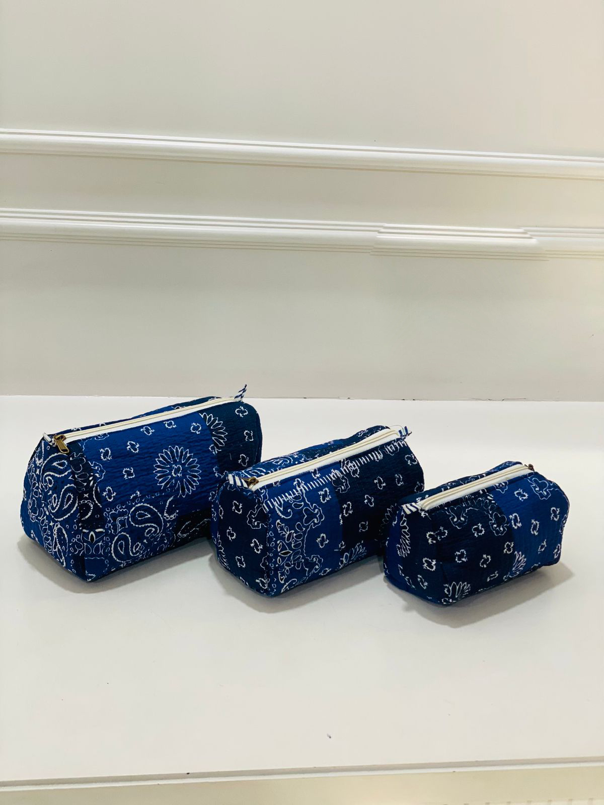 Grounded in the rich history of Indian craftsmanship, our navy paisley charm set is a tribute to the time-honored techniques of block printing. Each pouch showcases an elegant ensemble of paisley and floral motifs, meticulously crafted to bring a touch of artistry to your daily routine.