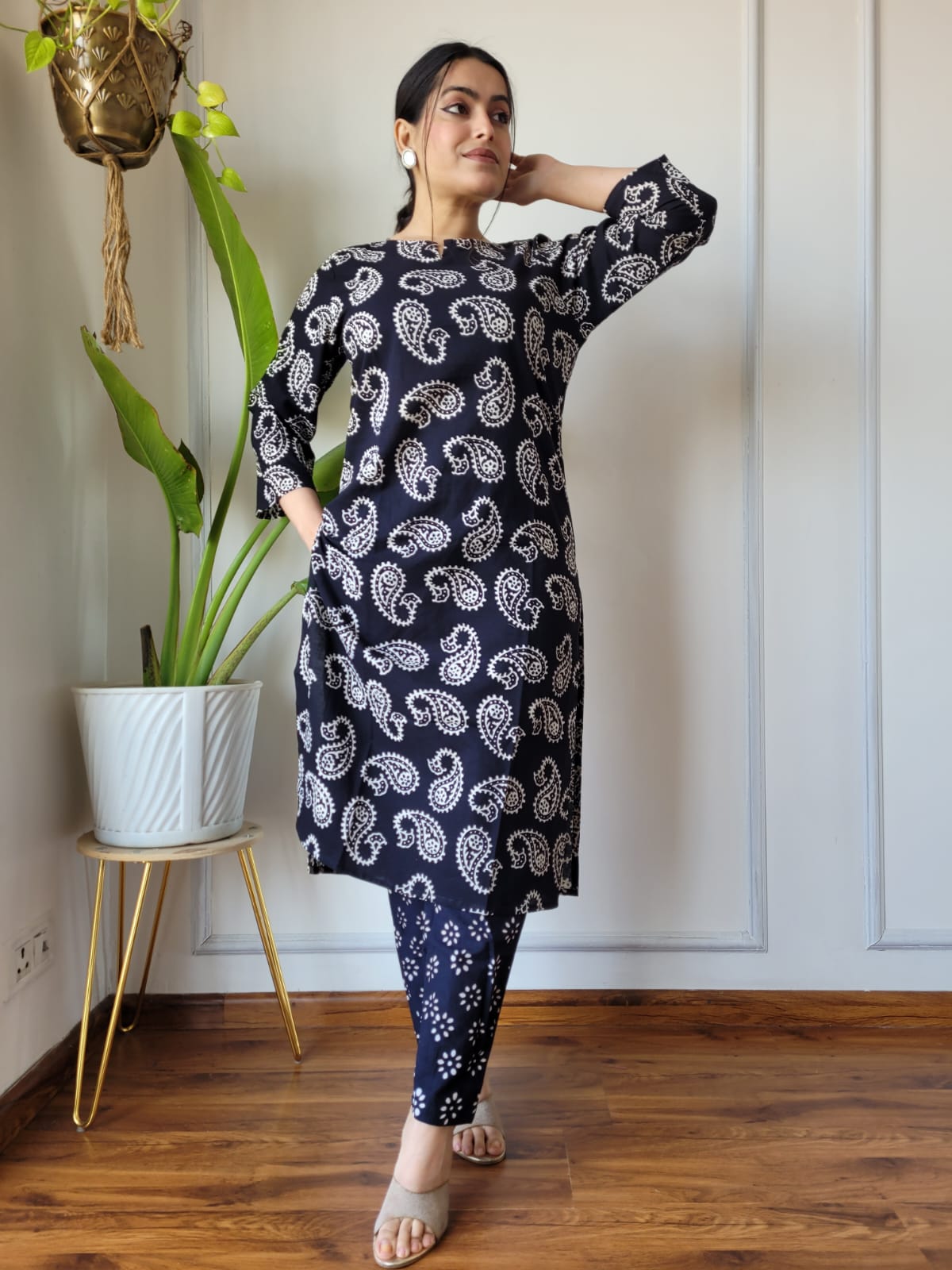 Embrace the elegance of Indian craftsmanship with our Navy Paisley Dream Cotton A-Line Kurti Set. This ensemble showcases a stunning interplay of intricate paisley motifs against a rich navy backdrop, capturing the essence of traditional artistry. Each piece is artisan-crafted, reflecting meticulous attention to detail that honors age-old techniques of hand block printing.