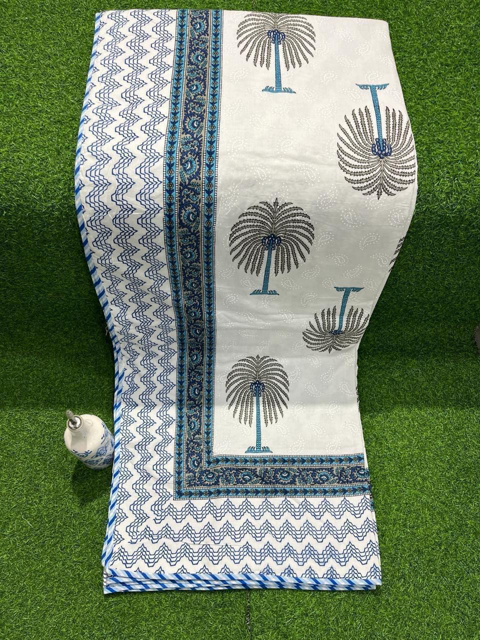 Infusing your space with a captivating blend of artistry and tradition, the Navy Palm Geometric Cotton Dohar celebrates the essence of hand block printing. The gorgeous interplay of deep navy and vibrant sky blue creates a striking canvas, accentuated by graceful palm tree motifs. Each detail captures the skilled craftsmanship that transcends generations, showcasing a perfect balance between organic forms and structured geometric patterns.